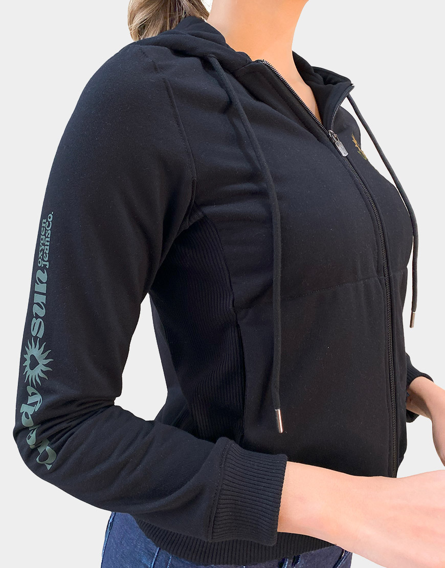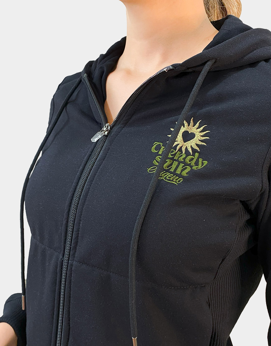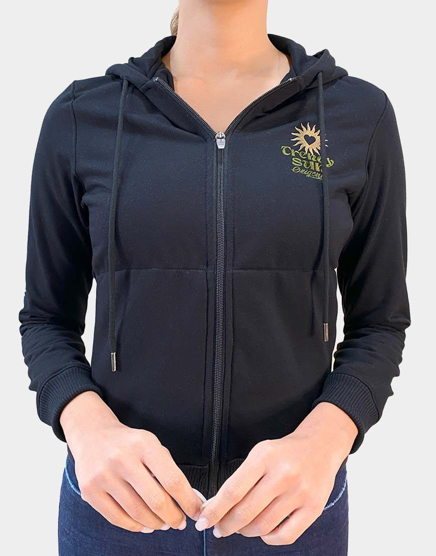 Buso para dama confeccionado en tejido de algodón perchado, que ofrece una textura interna suave y térmica para mayor calidez. Presenta un diseño funcional con cierre frontal de cremallera, capucha ajustable con cordones y bolsillos tipo canguro. La prenda destaca por sus detalles en rib en los puños y la pretina, que aseguran un ajuste cómodo y duradero, además de un sutil bordado en punto corazón con motivo solar en el pecho que añade un toque femenino y distintivo.