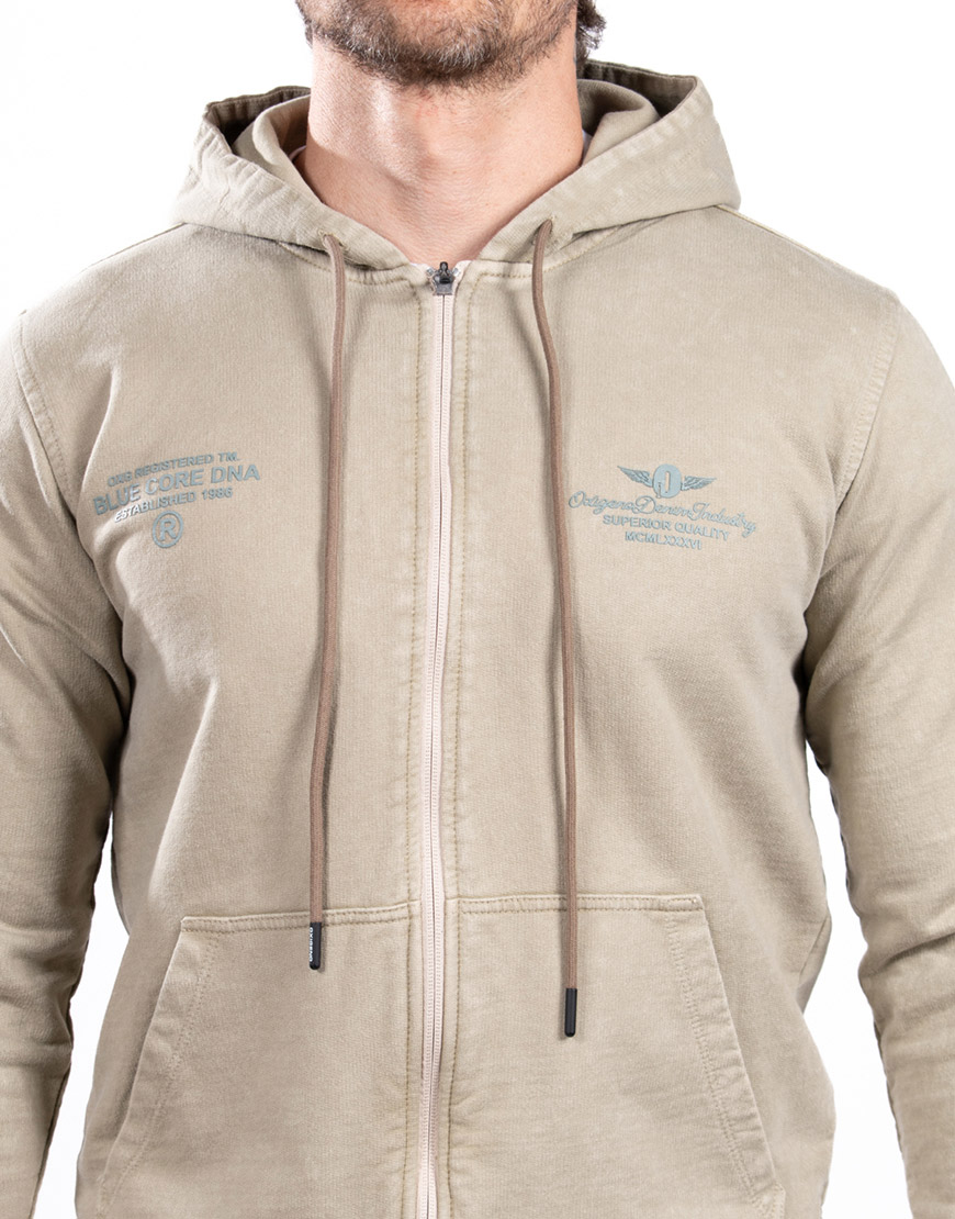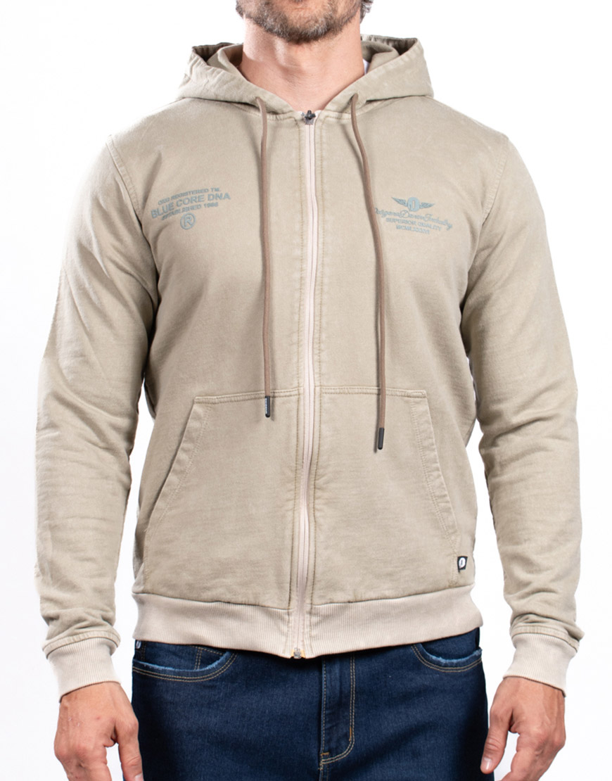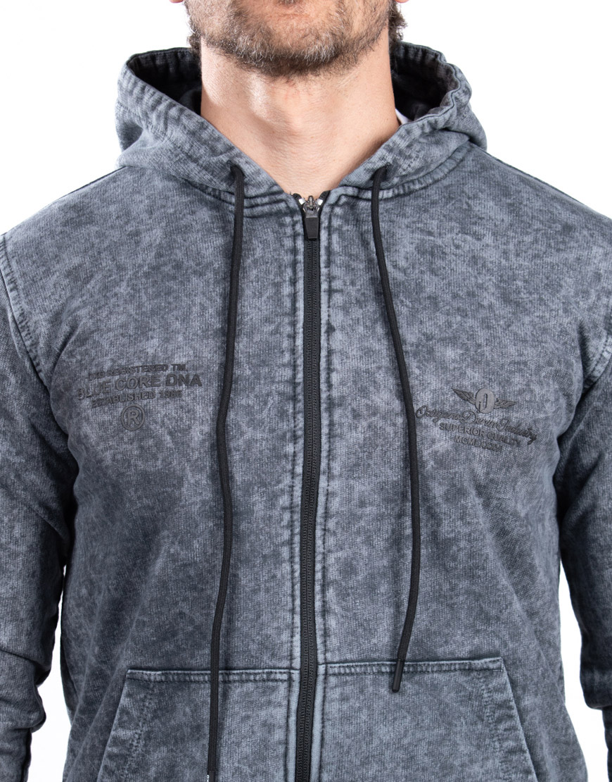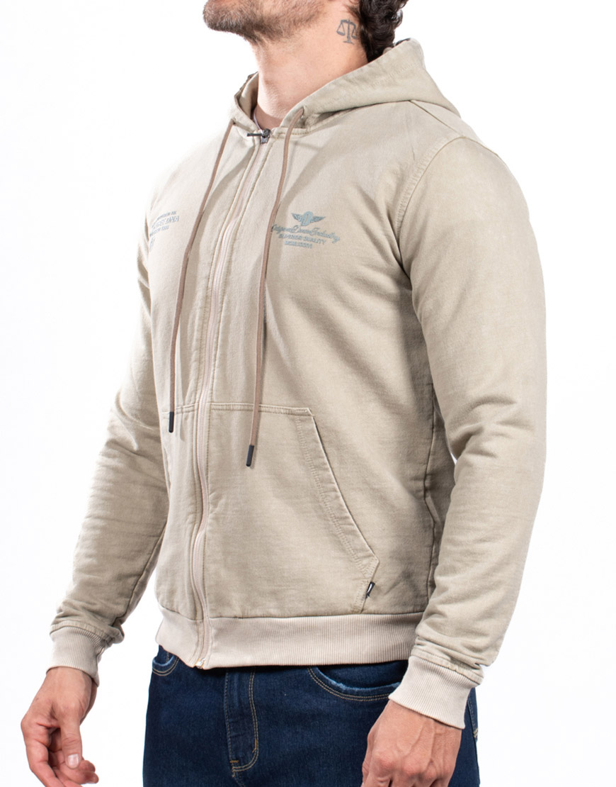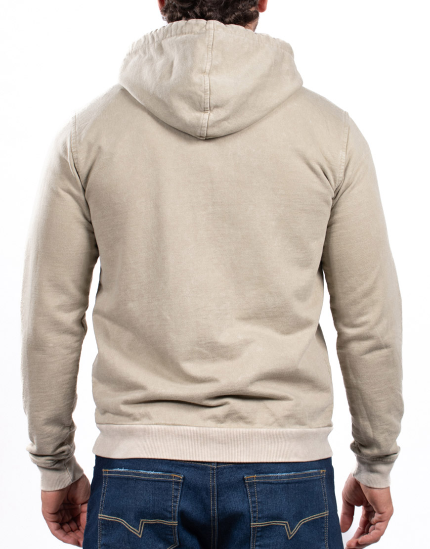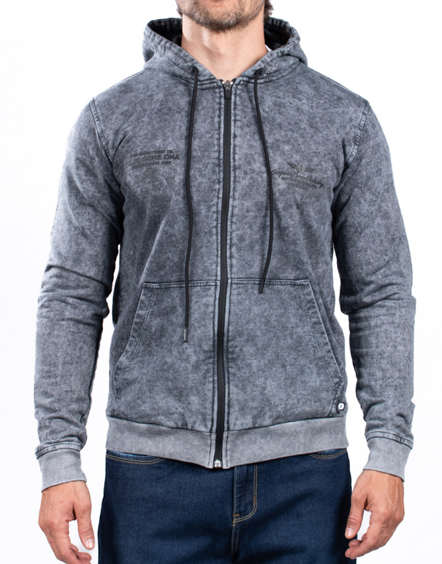 Buso para hombre elaborado en algodón, con acabado manual tipo desgaste, estampado frontal, cierre completo, capucha ajustable y bolsillos laterales integrados.