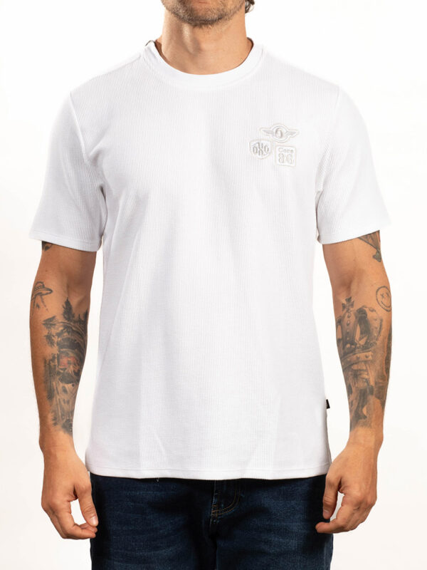Este buzo de moda presenta un cuello redondo clásico y un ruedo elástico que asegura un ajuste confortable. El diseño es sofisticado gracias al bordado tonal (del mismo color de la prenda) que le da un toque minimalista.