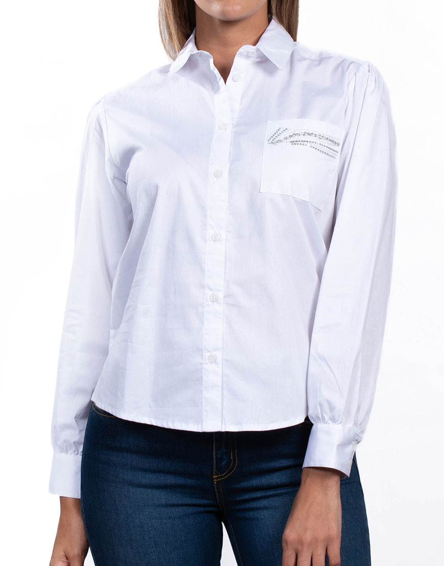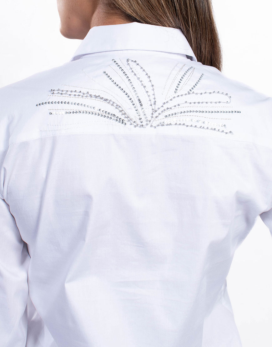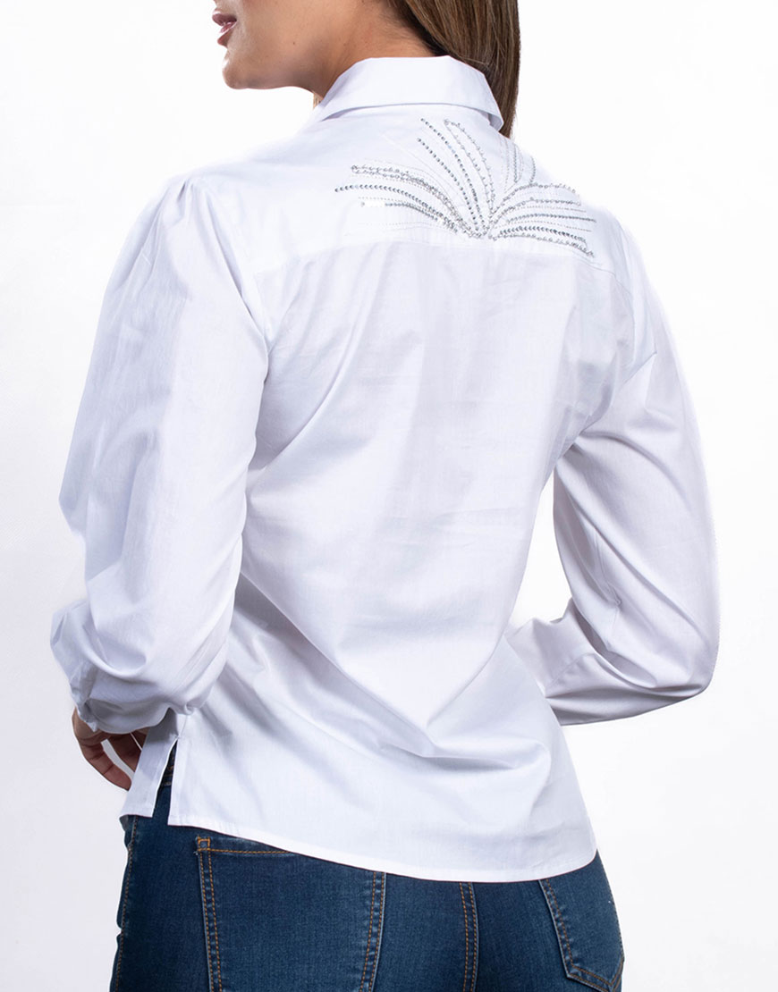 Camisa de dama con corte Slim Fit (ajustado). Confeccionada en tejido plano en algodón. Presenta cuello camisero , manga larga con pliegues de volumen en el hombro y puños abotonados. Incluye un bolsillo de parche en el frente. El diseño incorpora decoración de lentejuelas sobre el bolsillo frontal y un motivo decorativo de lentejuelas en la parte alta de la espalda. Cierre frontal mediante botonadura