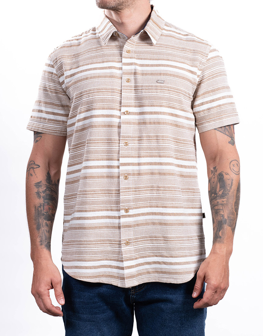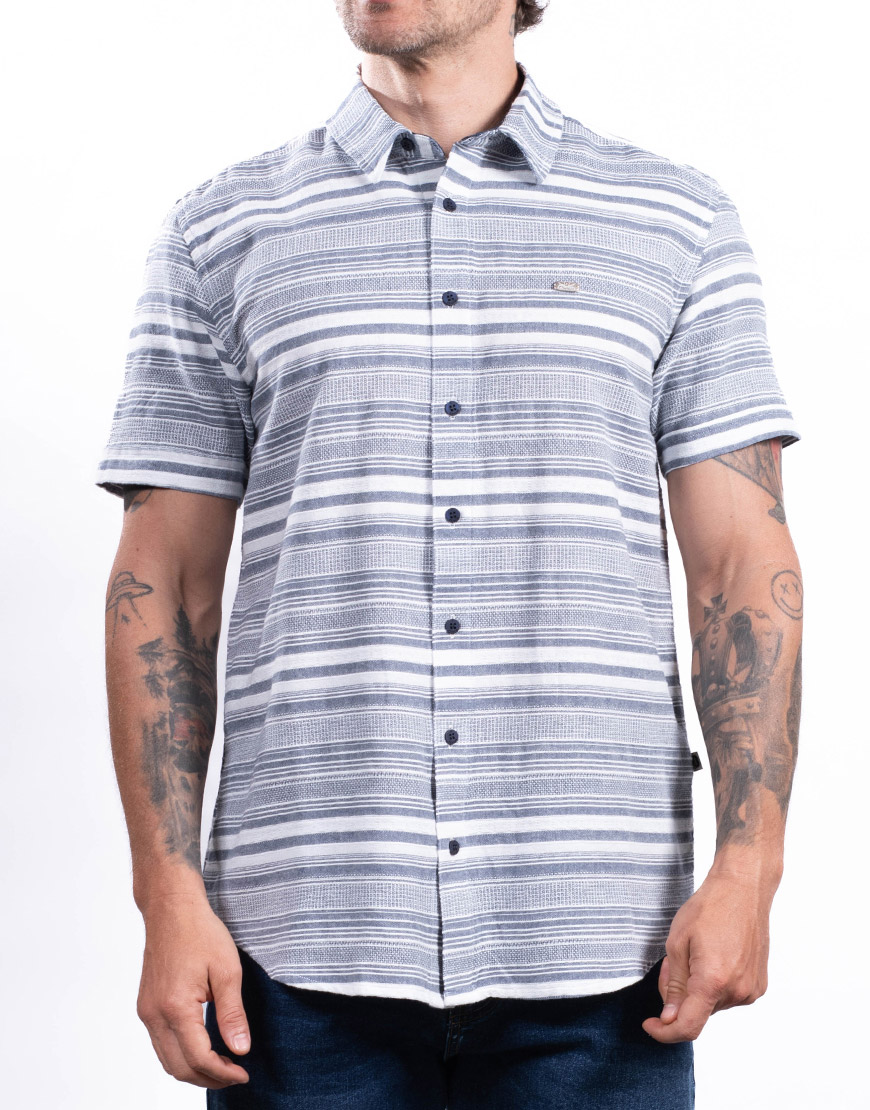 Camisa para hombre de manga corta confeccionada en tejido plano, cuello camisero, cierre frontal con botonadura, ajuste regular, estampado de rayas horizontales, bolsillo de parche en pecho, ruedo recto y costuras reforzadas para mayor durabilidad.
