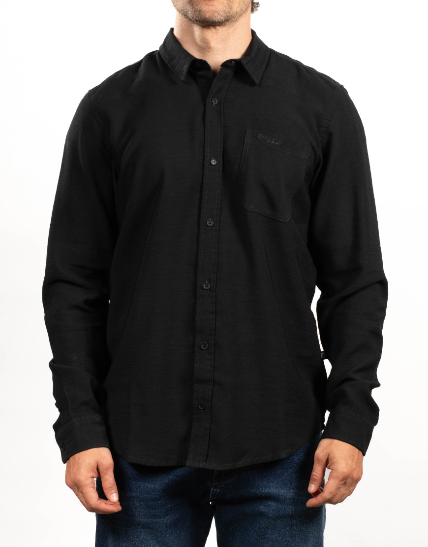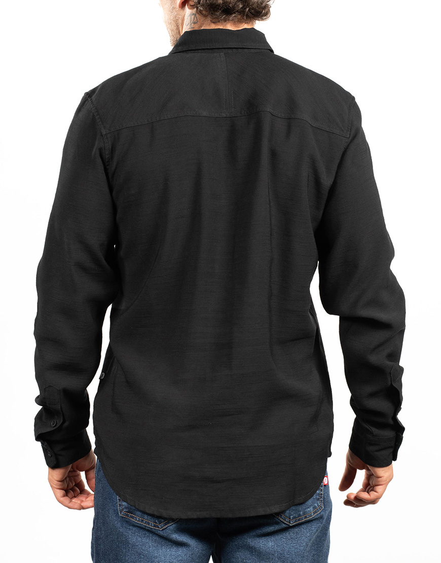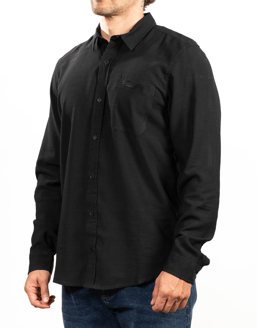 Camisa manga larga confeccionada en tela delgada de tacto suave, con cierre de botones frontales, bolsillo superior con bordado tonal, cuello clásico y puños ajustables. Ajuste regular.
