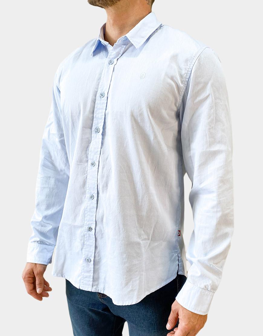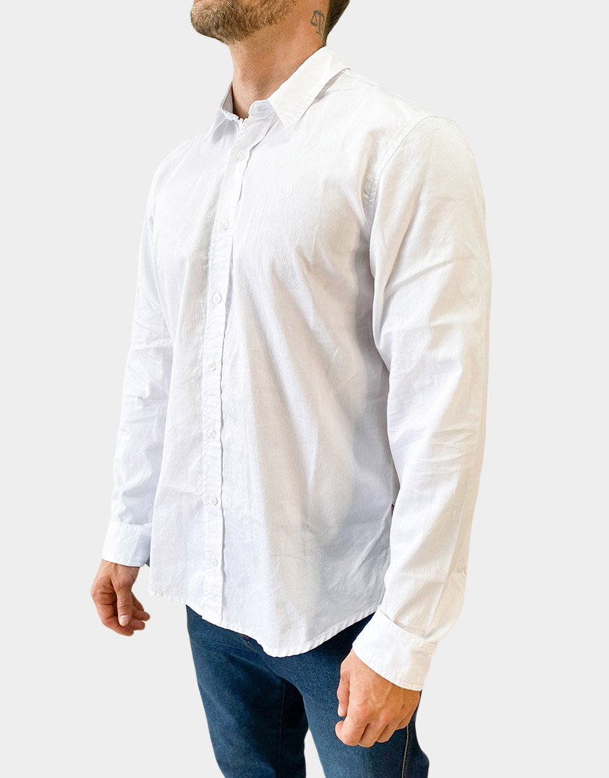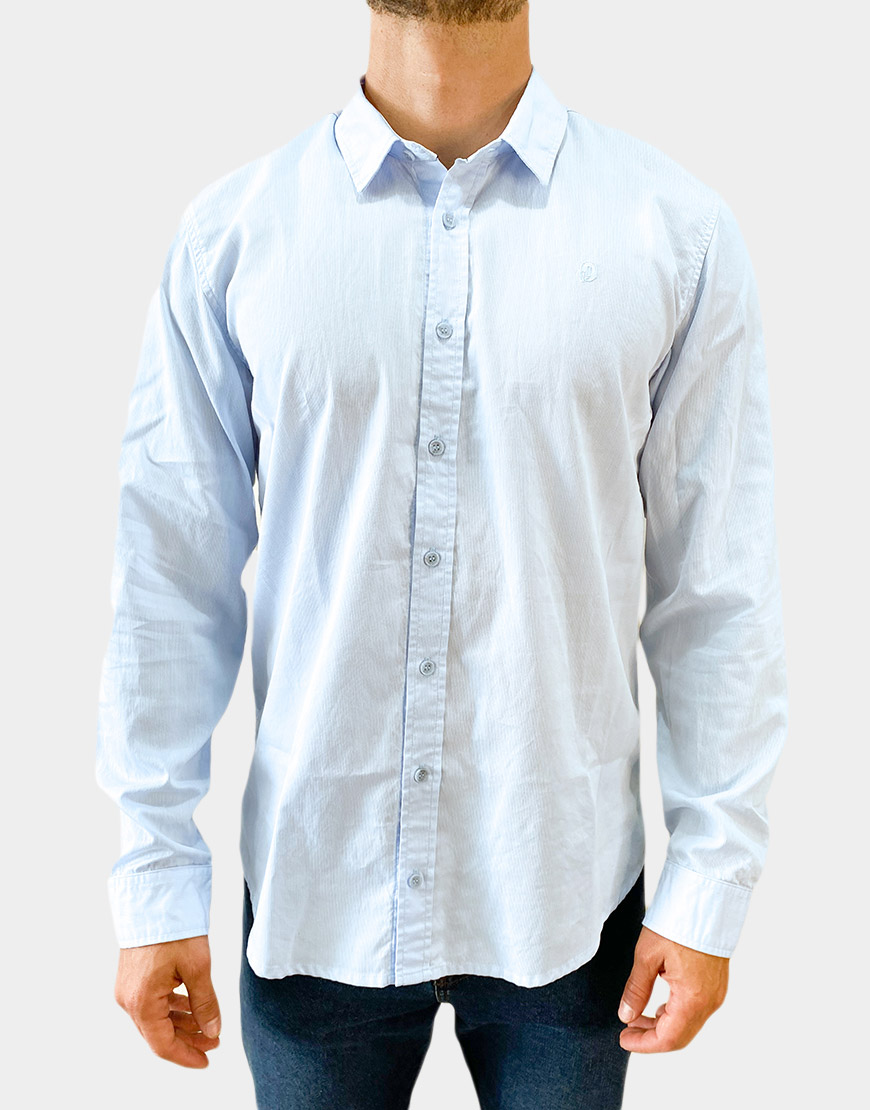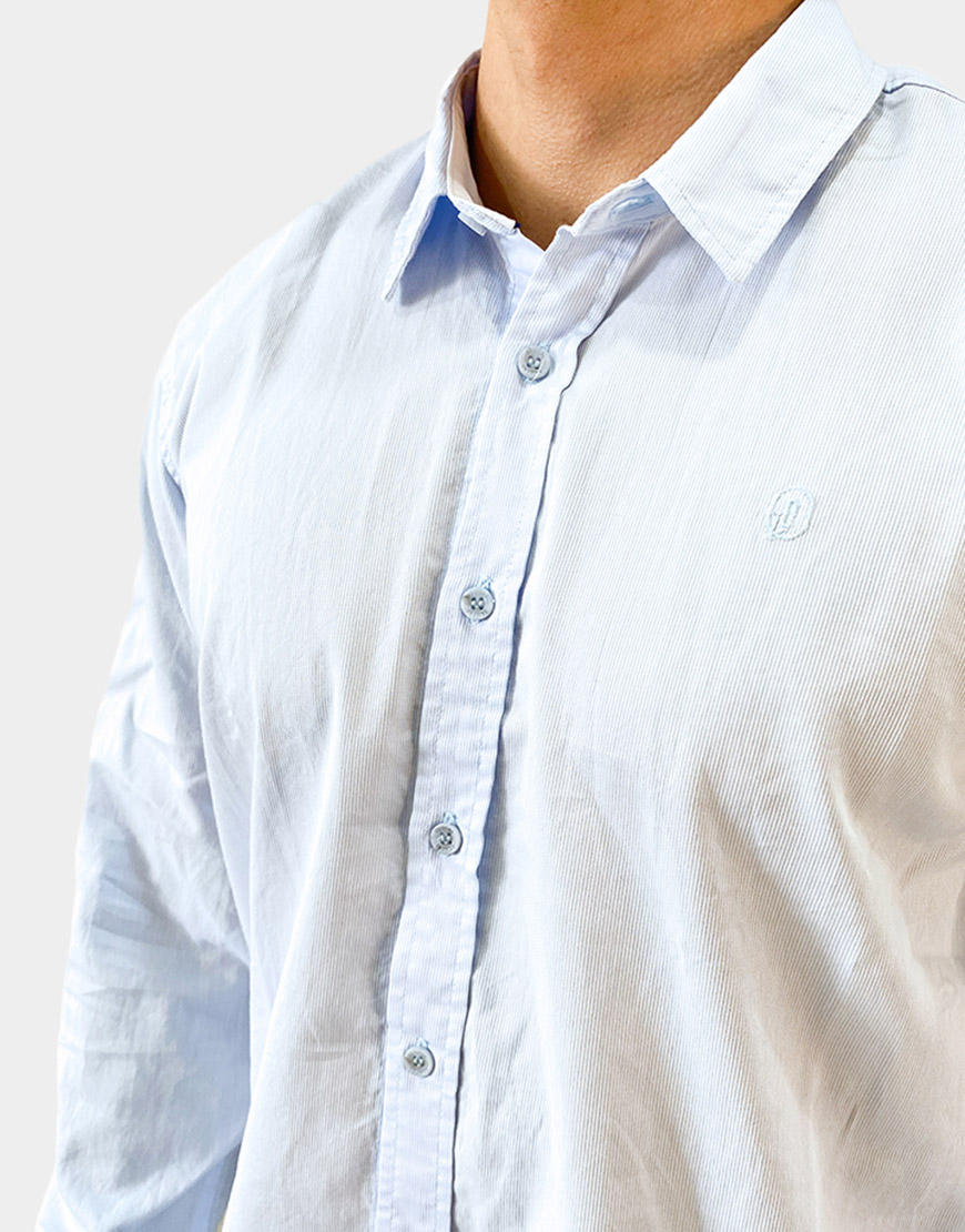 Camisa de manga larga confeccionada en una base textil ligera con diseño de rayas verticales sutiles que aportan textura y elegancia visual. Su silueta slim fit se complementa con un cuello clásico estructurado, pechera de botones frontales al tono y puños ajustables. Incluye un delicado bordado de marca en el pecho y una marquilla lateral distintiva, logrando una prenda versátil de estética pulcra ideal para entornos profesionales o eventos casuales.
