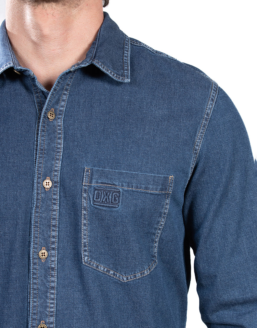 Camisa de hombre con silueta Regular Fit. Confeccionada en tejido índigo (denim) de color azul claro. Presenta manga larga con puños abotonados. Incluye un bolsillo de parche funcional en el pecho con un bordado de emblema de la marca. El cierre frontal es de botonadura con botones metálicos.