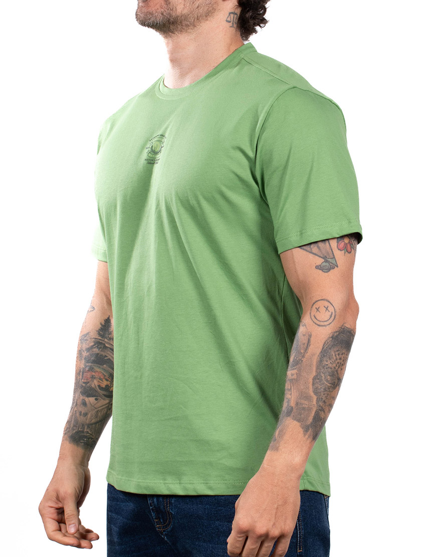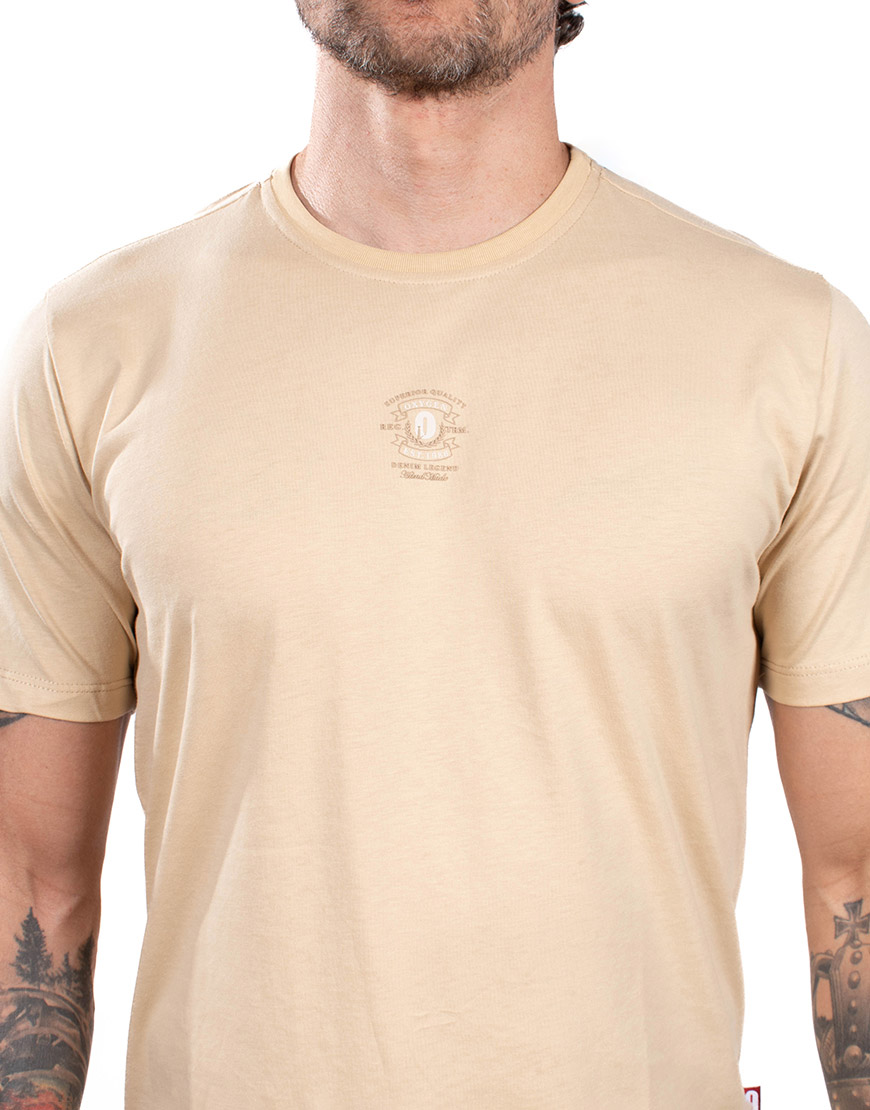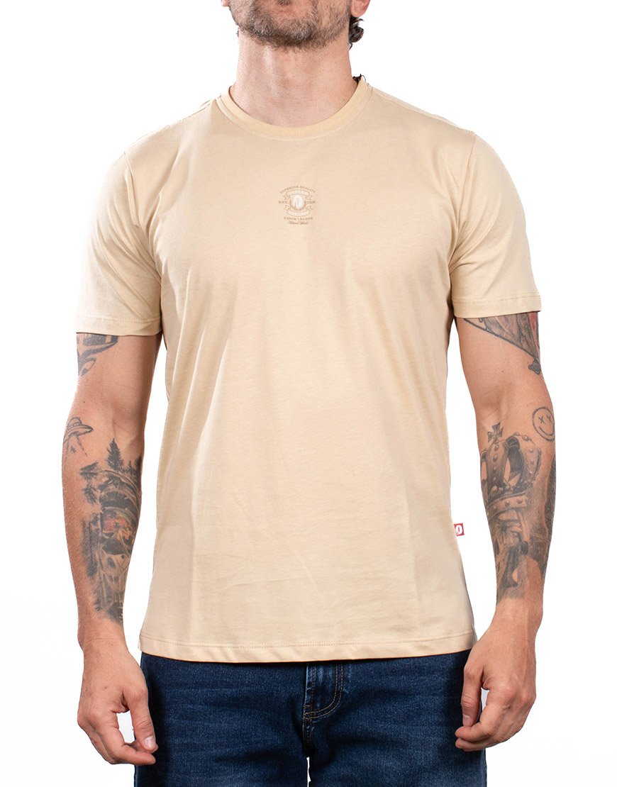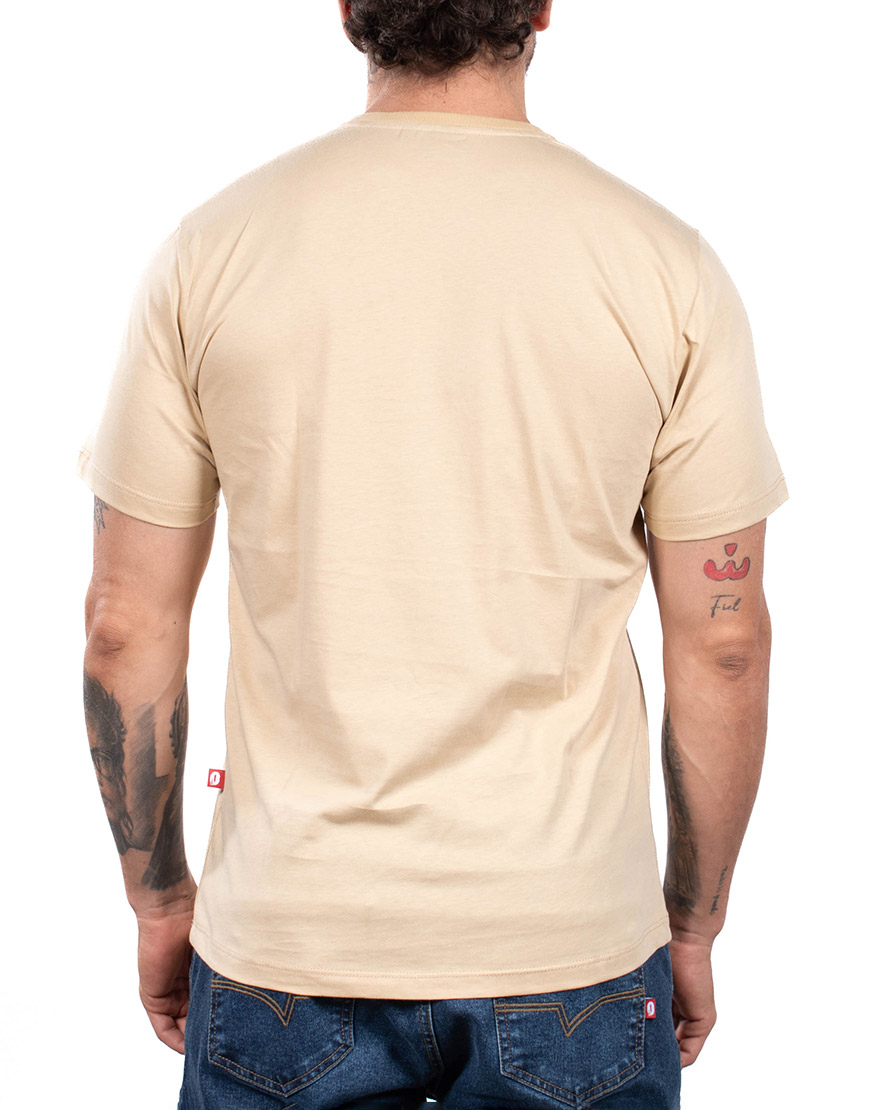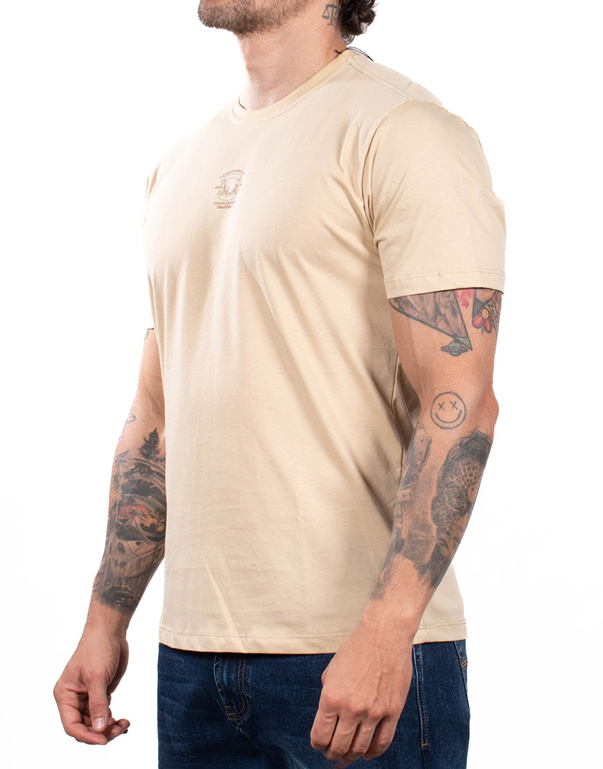Camiseta clásica unisex en color beige, confeccionada en algodón suave de alta calidad para brindar frescura y comodidad. Presenta un diseño regular fit con cuello redondo y un pequeño estampado al tono en el pecho que aporta un estilo minimalista y versátil. Ideal para combinar con jeans o bermudas, siendo una prenda básica e infaltable en tu armario casual.