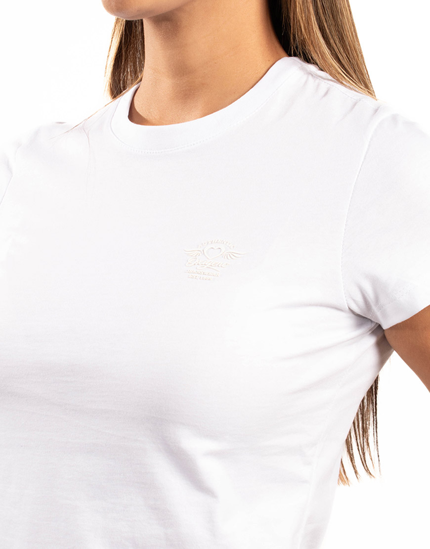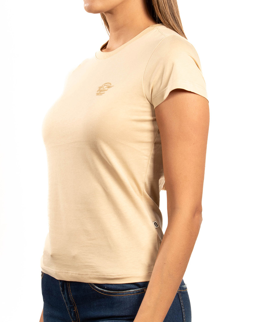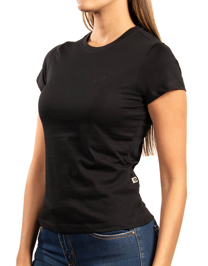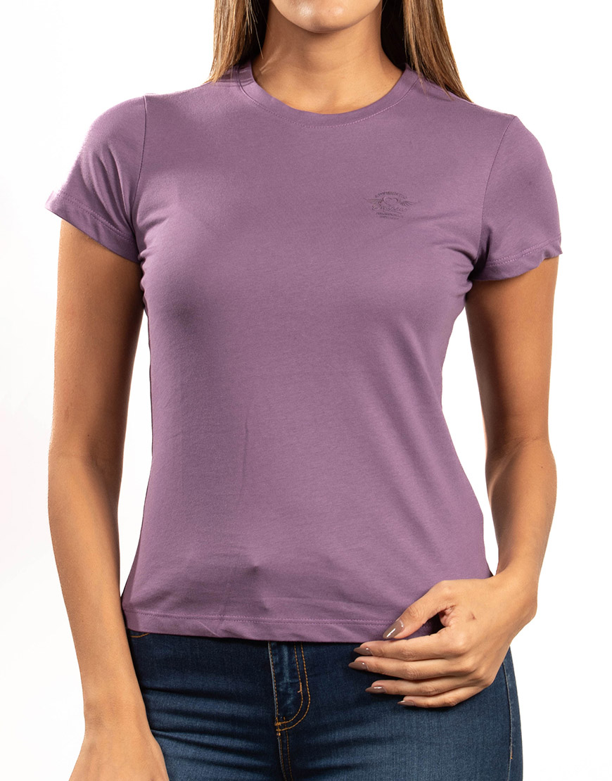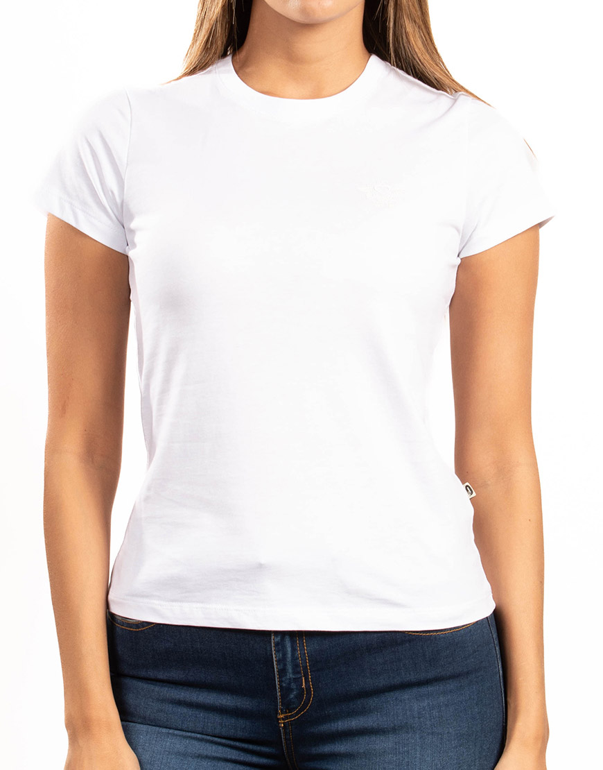 Camiseta de cuello redondo para mujer con un corte Slim Fit que ofrece una silueta entallada y favorecedora. Confeccionada en algodón suave y de alta calidad para un tacto cómodo. El diseño es clásico y minimalista, destacando por un estampado sutil al tono (del mismo color de la tela) ubicado en la zona del pecho o punto corazón. Este detalle discreto y elegante la convierte en una prenda esencial y versátil para el día a día.