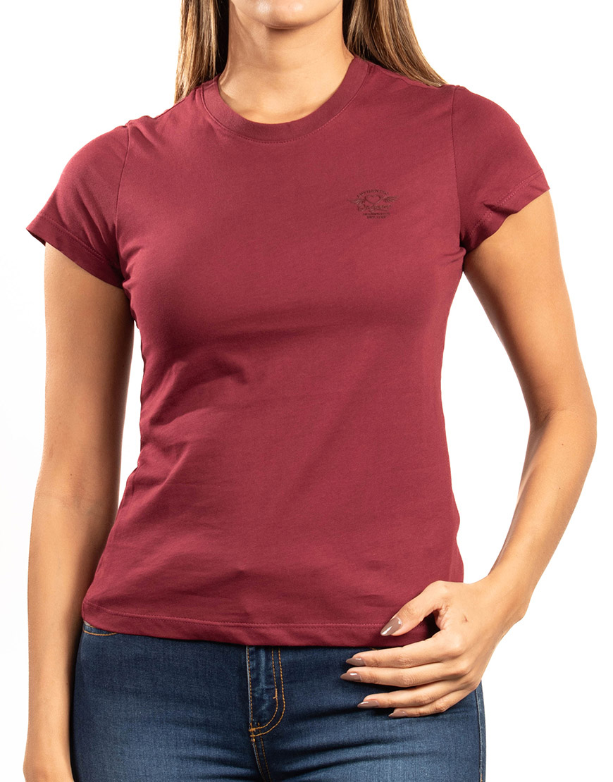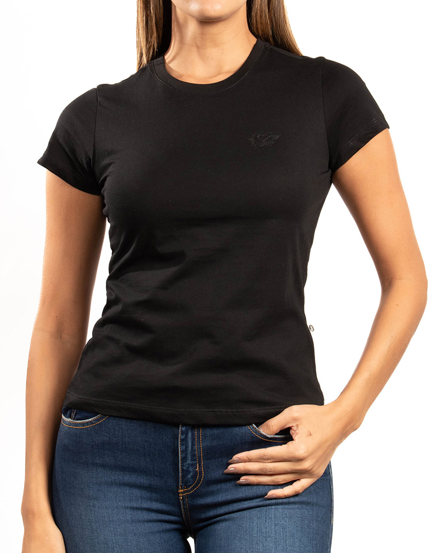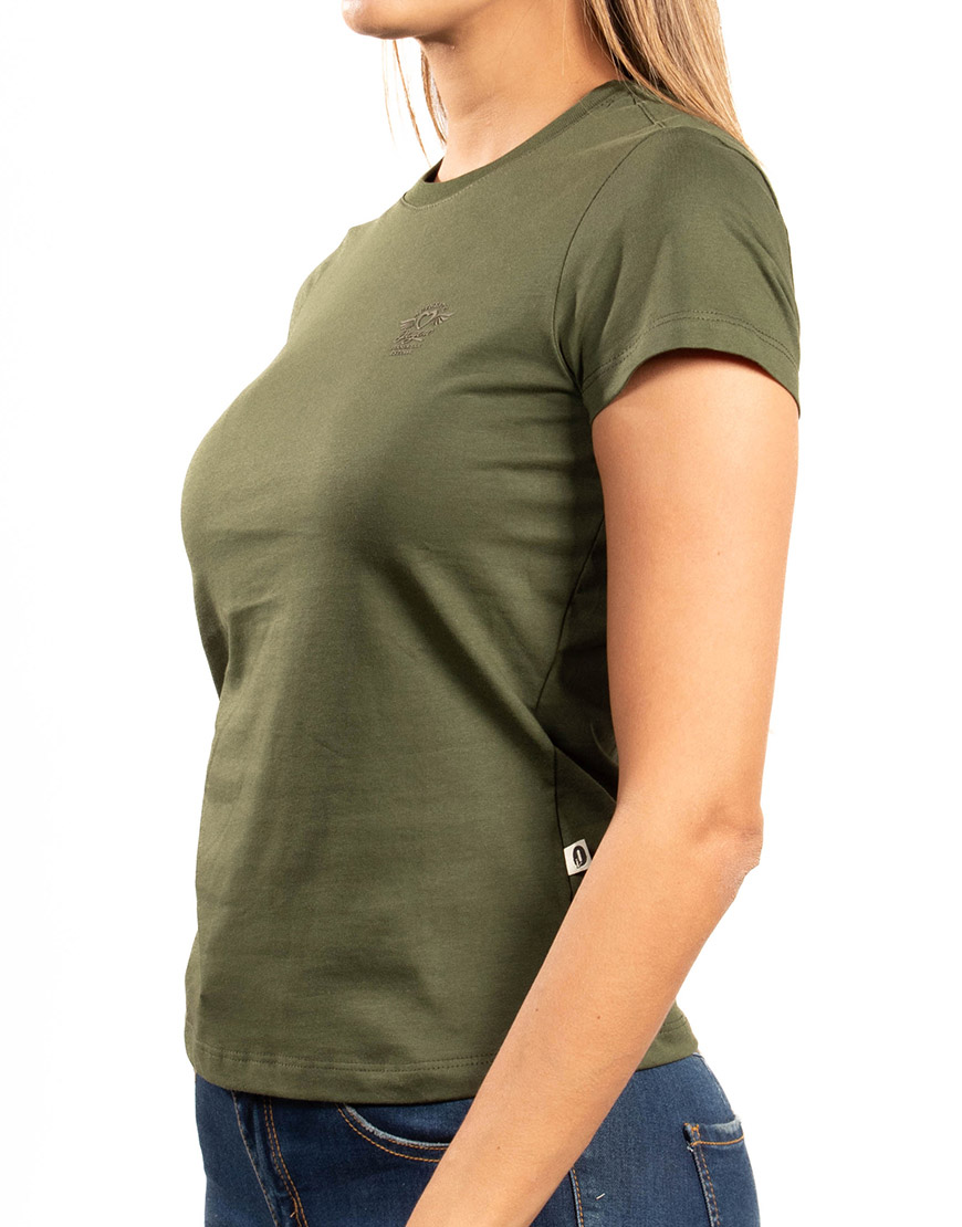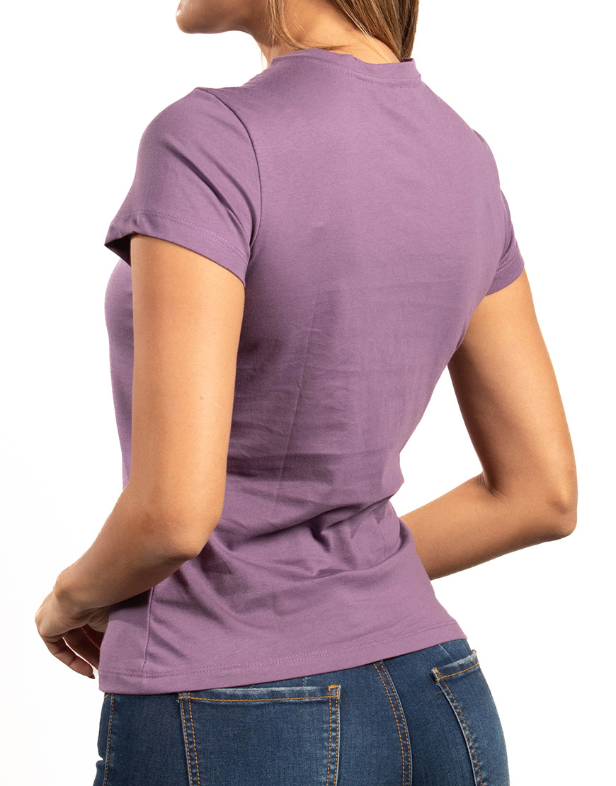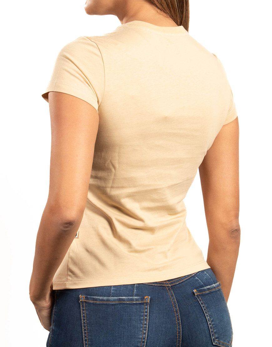 Camiseta de cuello redondo para mujer con un corte Slim Fit que ofrece una silueta entallada y favorecedora. Confeccionada en algodón suave y de alta calidad para un tacto cómodo. El diseño es clásico y minimalista, destacando por un estampado sutil al tono (del mismo color de la tela) ubicado en la zona del pecho o punto corazón. Este detalle discreto y elegante la convierte en una prenda esencial y versátil para el día a día.