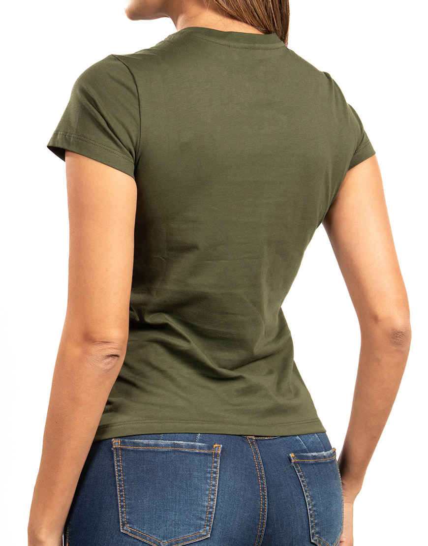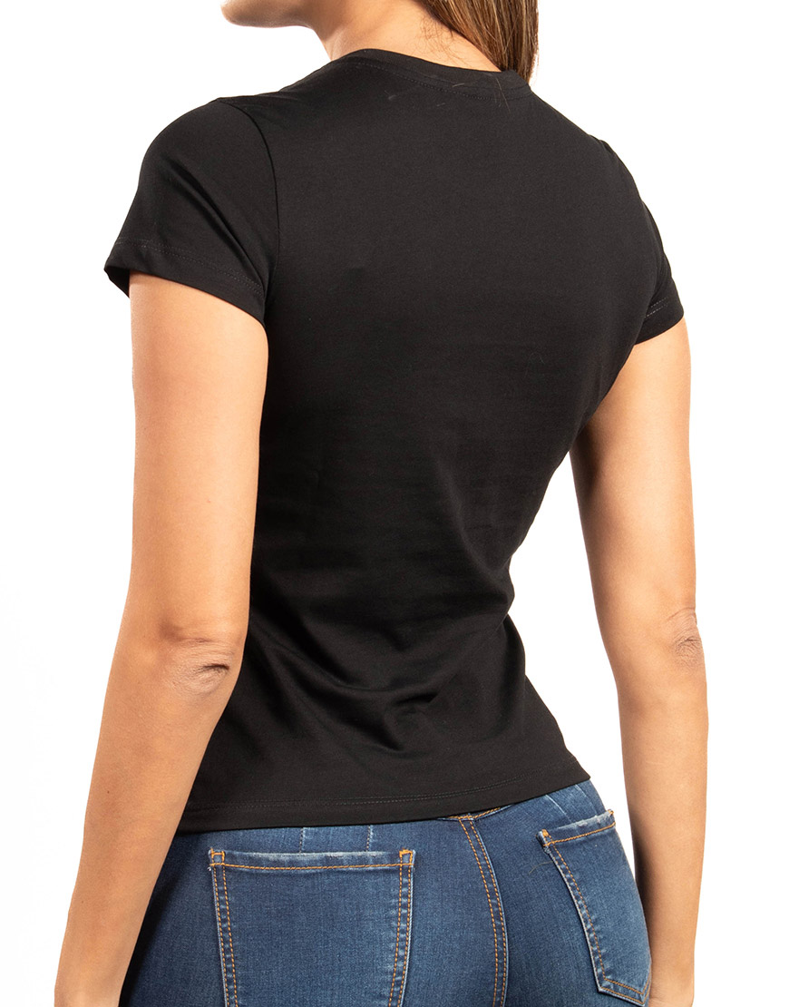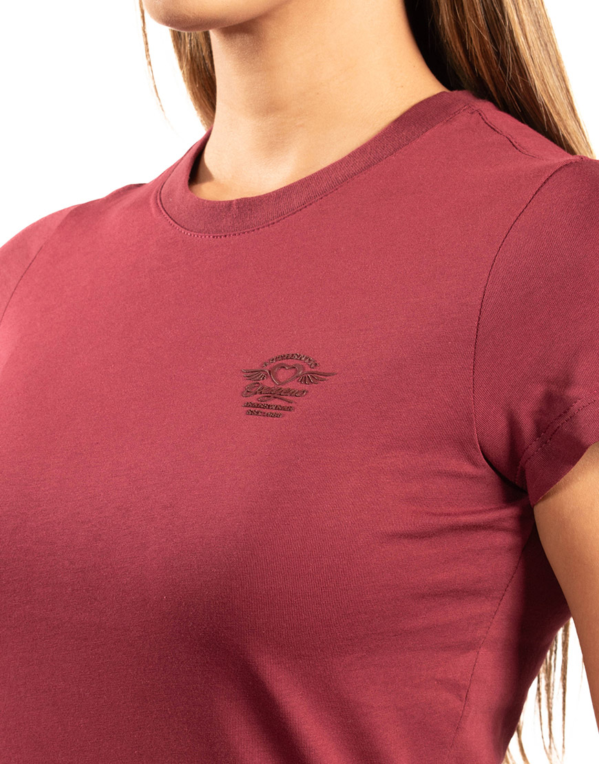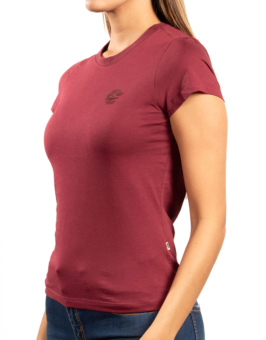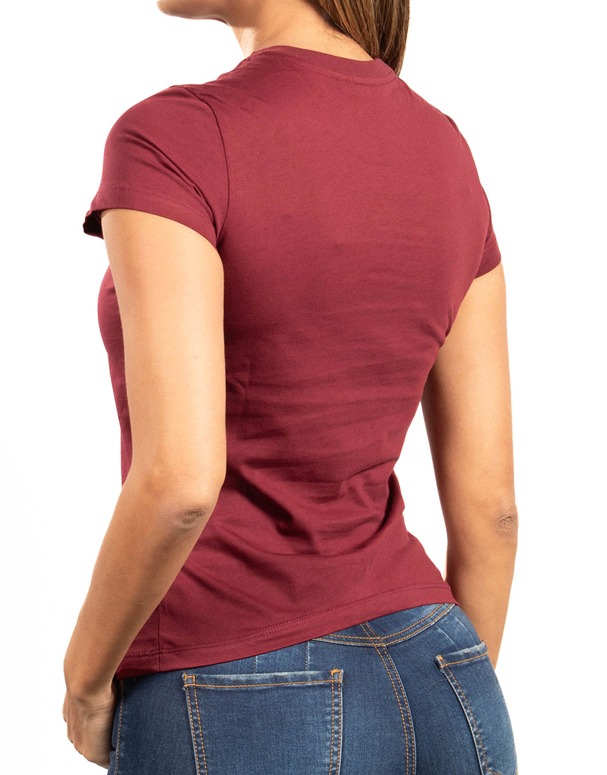 Camiseta de cuello redondo para mujer con un corte Slim Fit que ofrece una silueta entallada y favorecedora. Confeccionada en algodón suave y de alta calidad para un tacto cómodo. El diseño es clásico y minimalista, destacando por un estampado sutil al tono (del mismo color de la tela) ubicado en la zona del pecho o punto corazón. Este detalle discreto y elegante la convierte en una prenda esencial y versátil para el día a día.