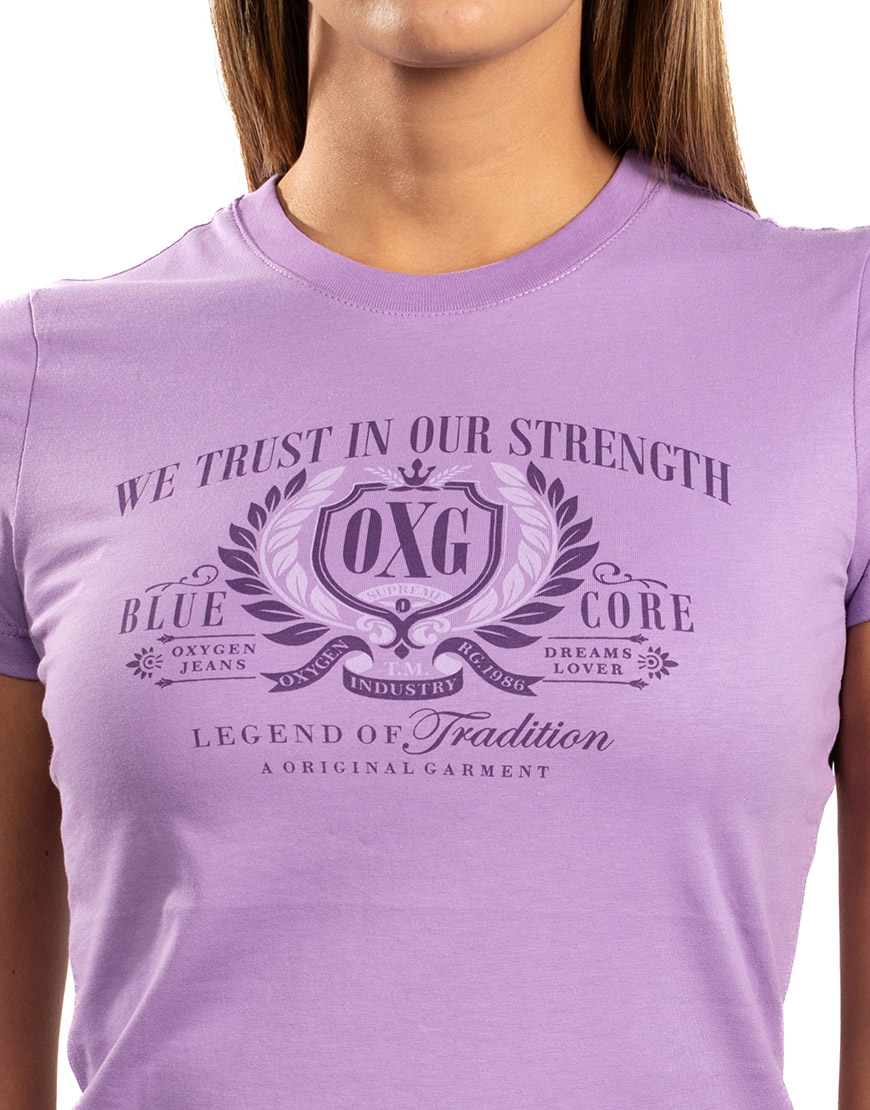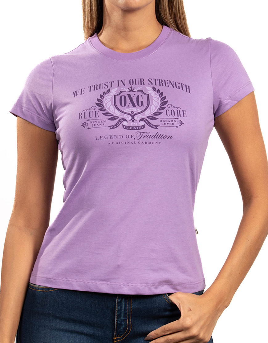 Camiseta para dama confeccionada en tejido de algodón suave, que garantiza frescura y una textura agradable al contacto con la piel. Presenta un diseño de silueta clásica con cuello redondo y manga corta, ideal para un uso diario versátil. Destaca por su estampado central de estilo heráldico, que incluye el escudo «OXG» rodeado de laureles y la frase «Legend of Tradition», aportando un aire de autenticidad y elegancia deportiva a la prenda.