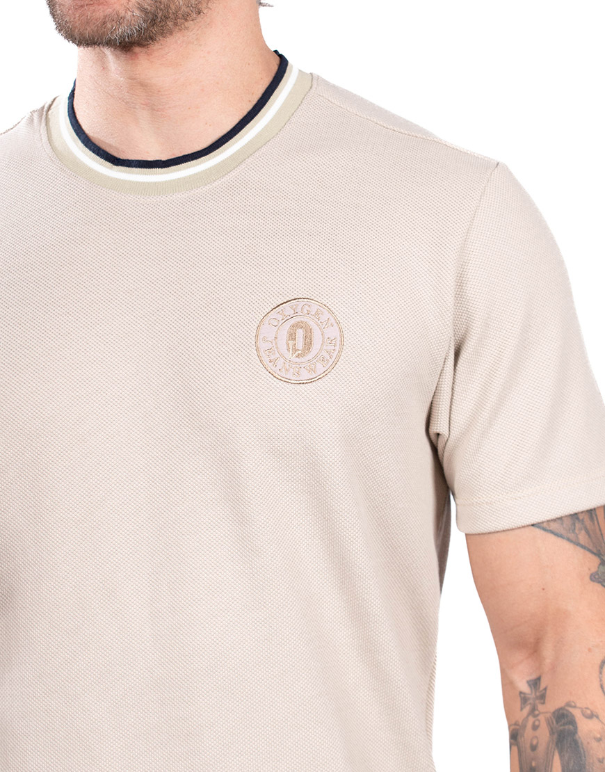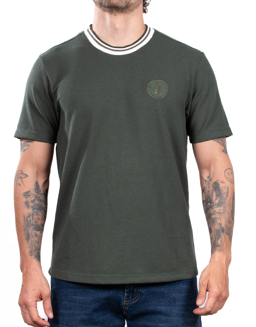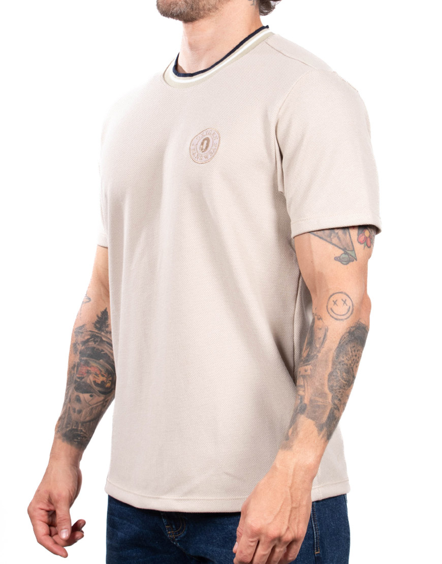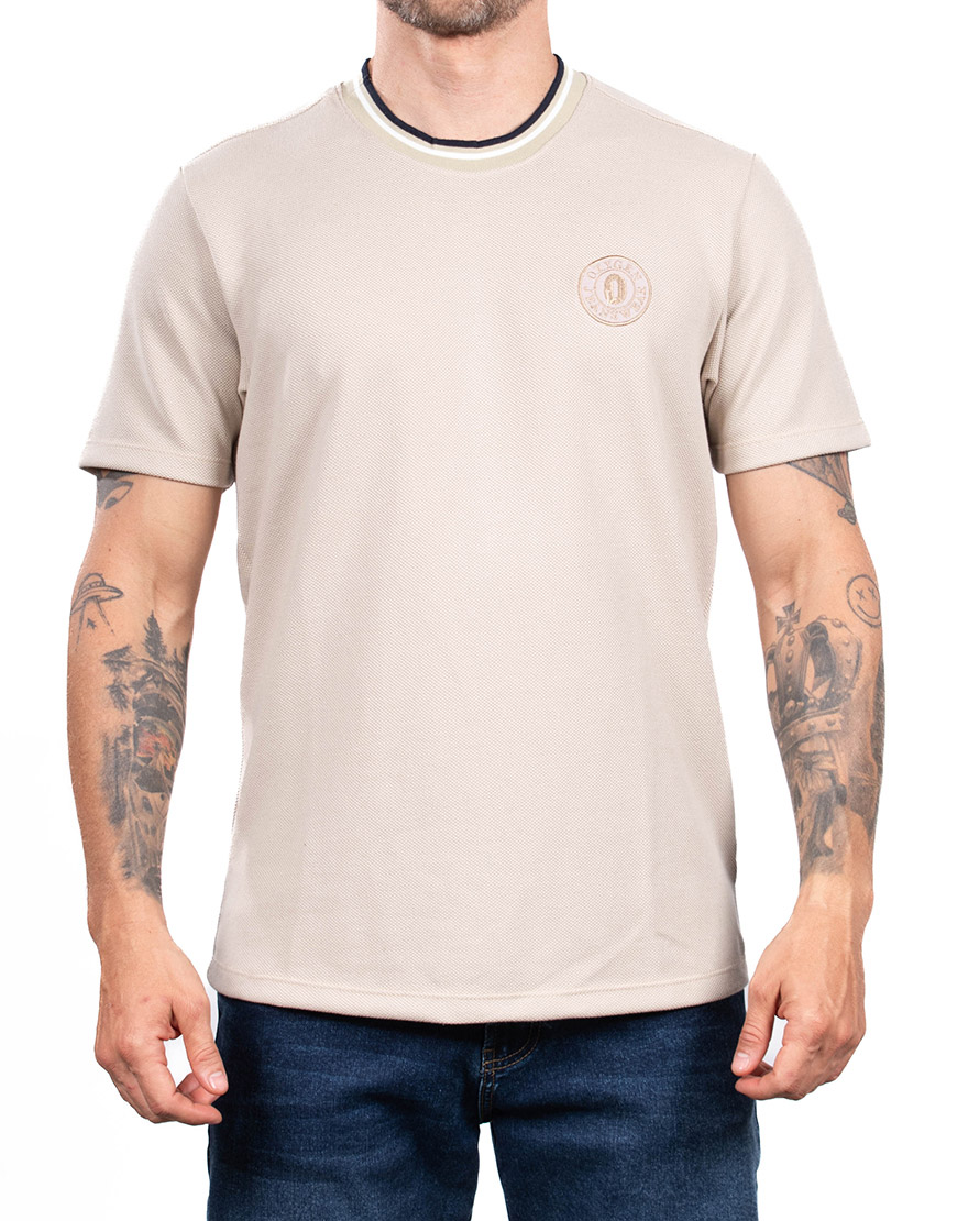 Camiseta de hombre de corte Regular Fit . El tejido principal es de algodón texturizado. Cuello redondo tejido de punto acanalado,. con un parche bordado circular con tipografía de la marca, ubicado en el pecho.