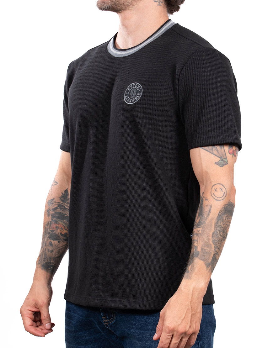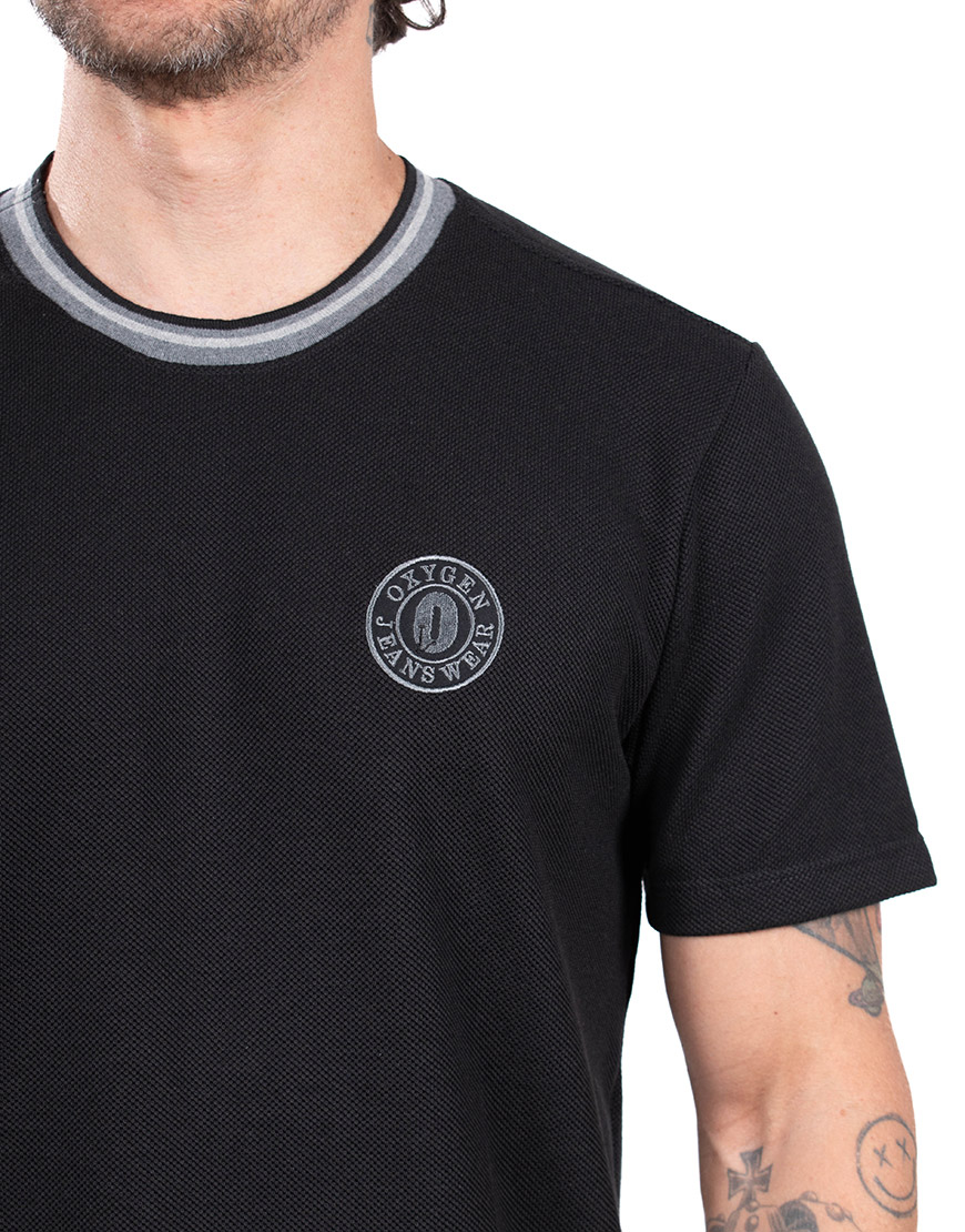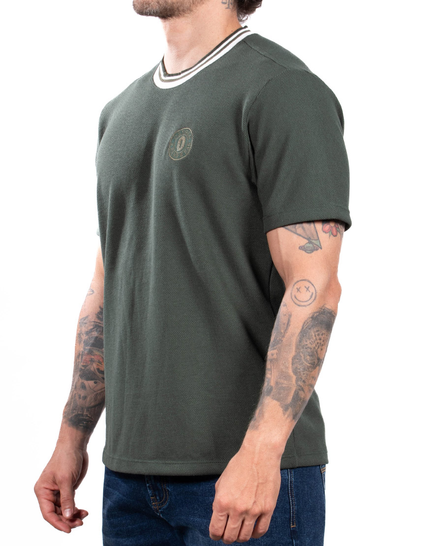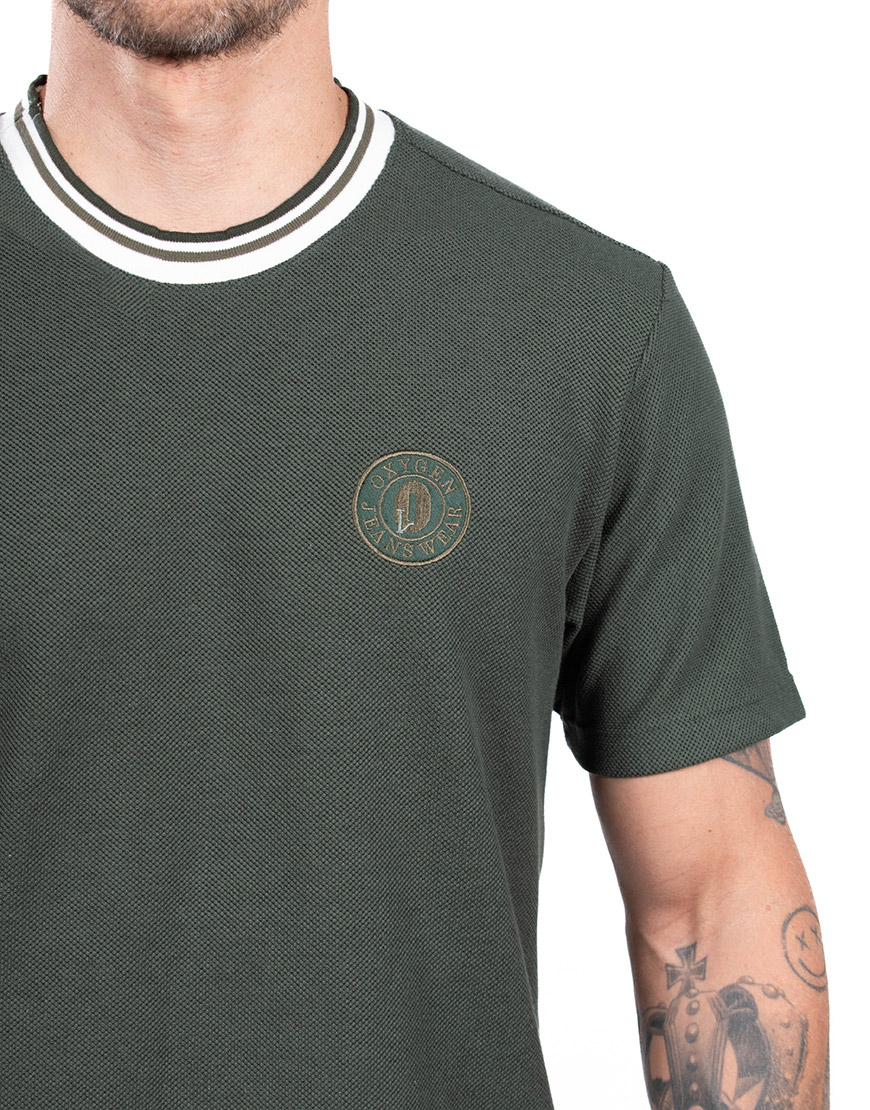 Camiseta de hombre de corte Regular Fit . El tejido principal es de algodón texturizado. Cuello redondo tejido de punto acanalado,. con un parche bordado circular con tipografía de la marca, ubicado en el pecho.