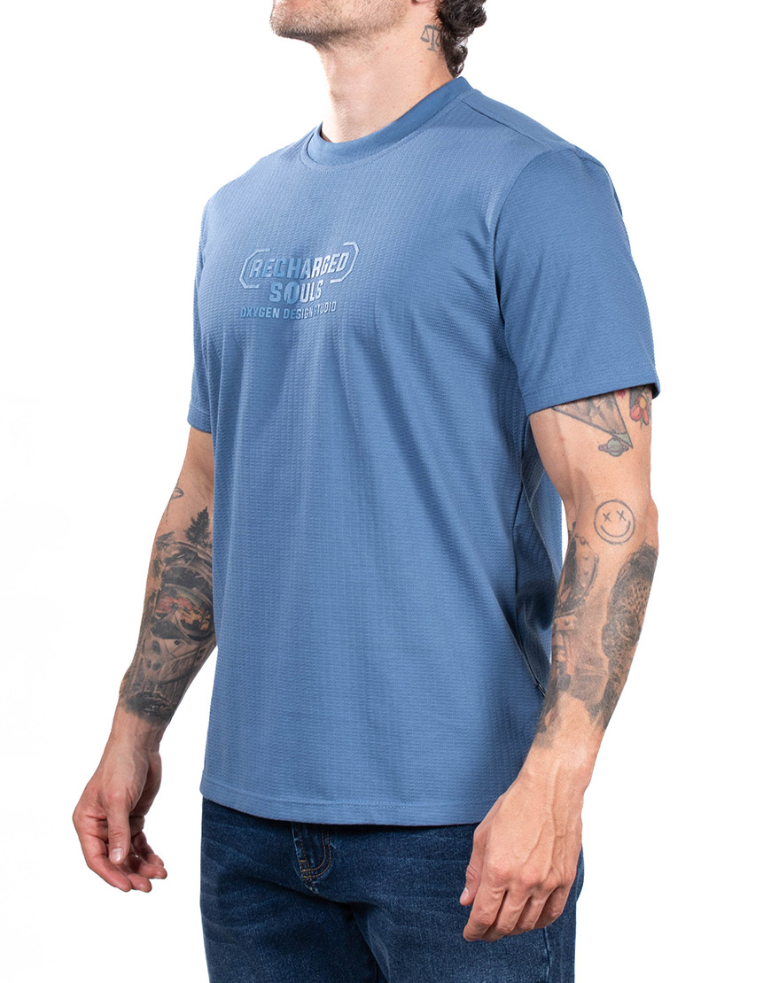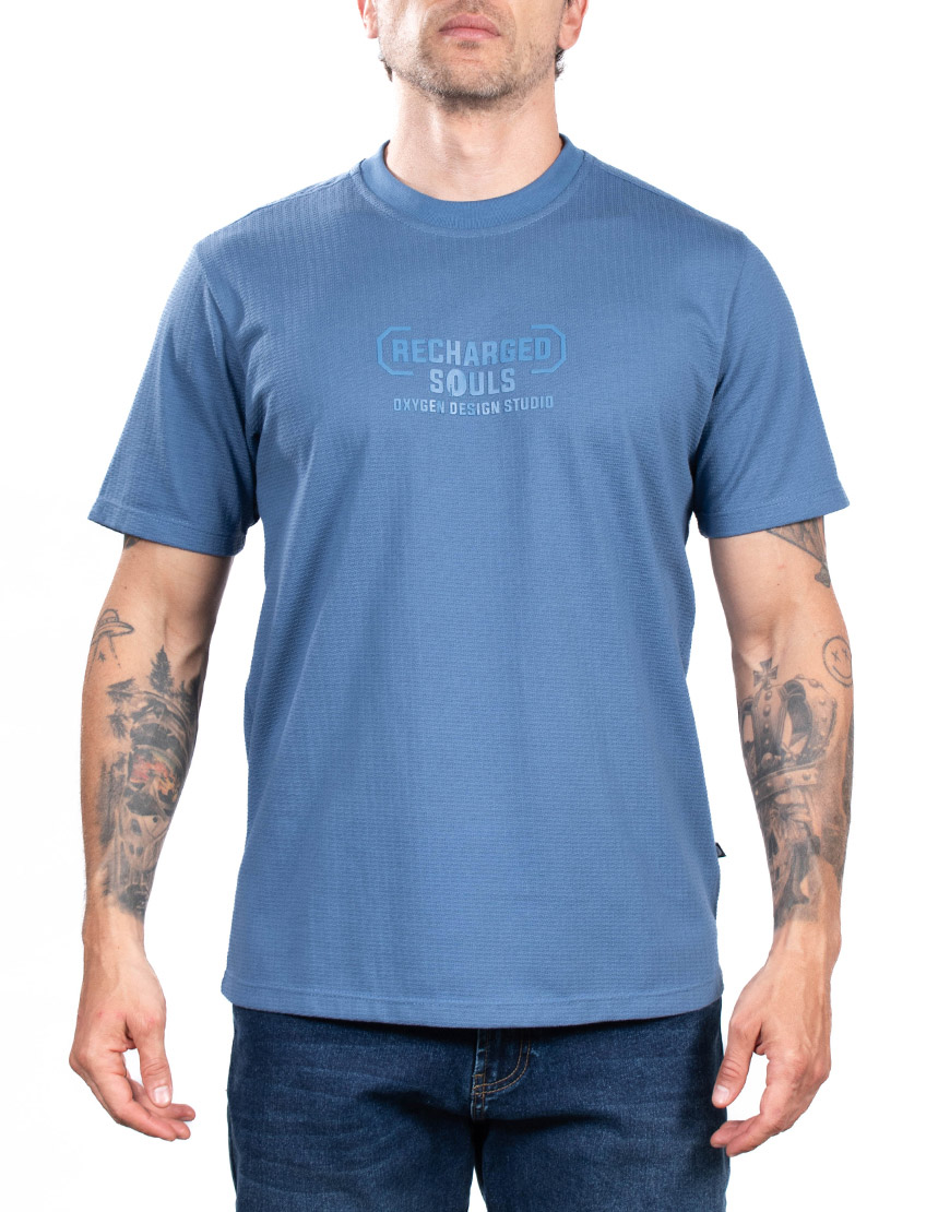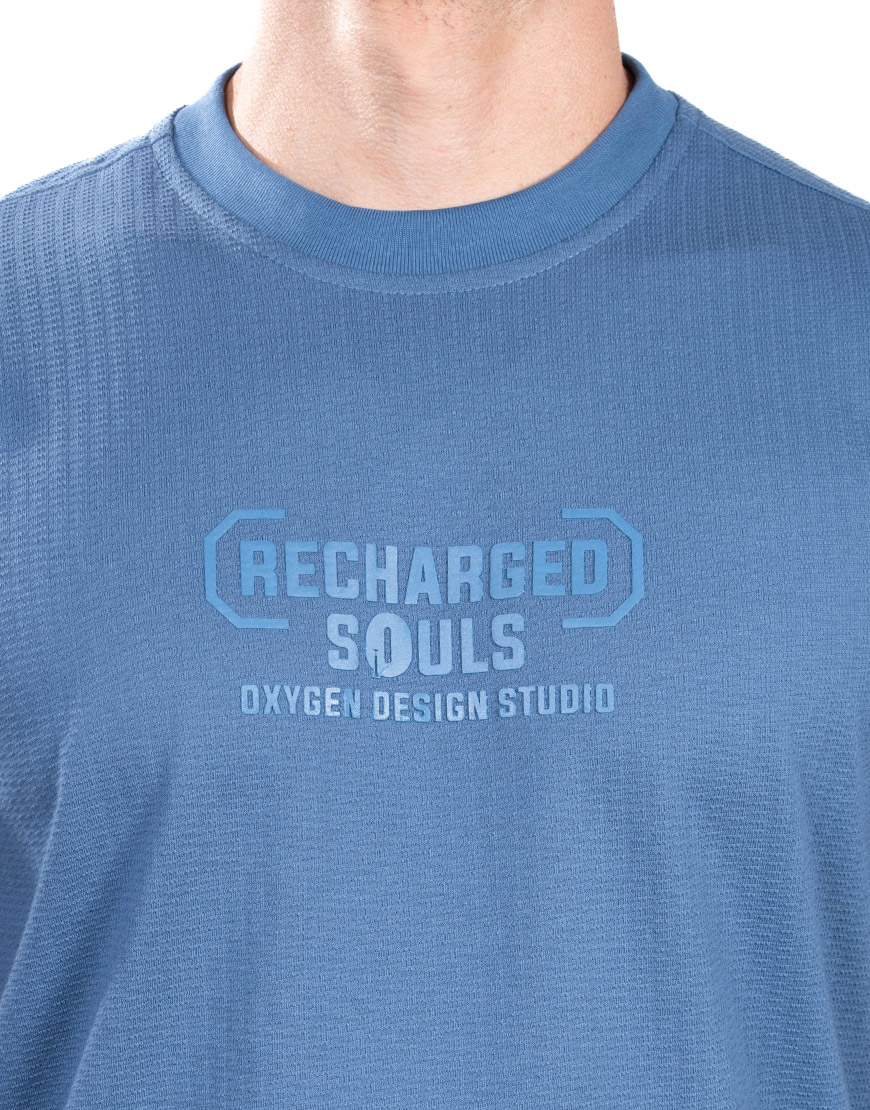 Su diseño de cuello redondo incluye un estampado en relieve al tono con el mensaje «Recharged Souls – Oxygen Design Studio», añadiendo una textura sofisticada y un toque de distinción al look casual.