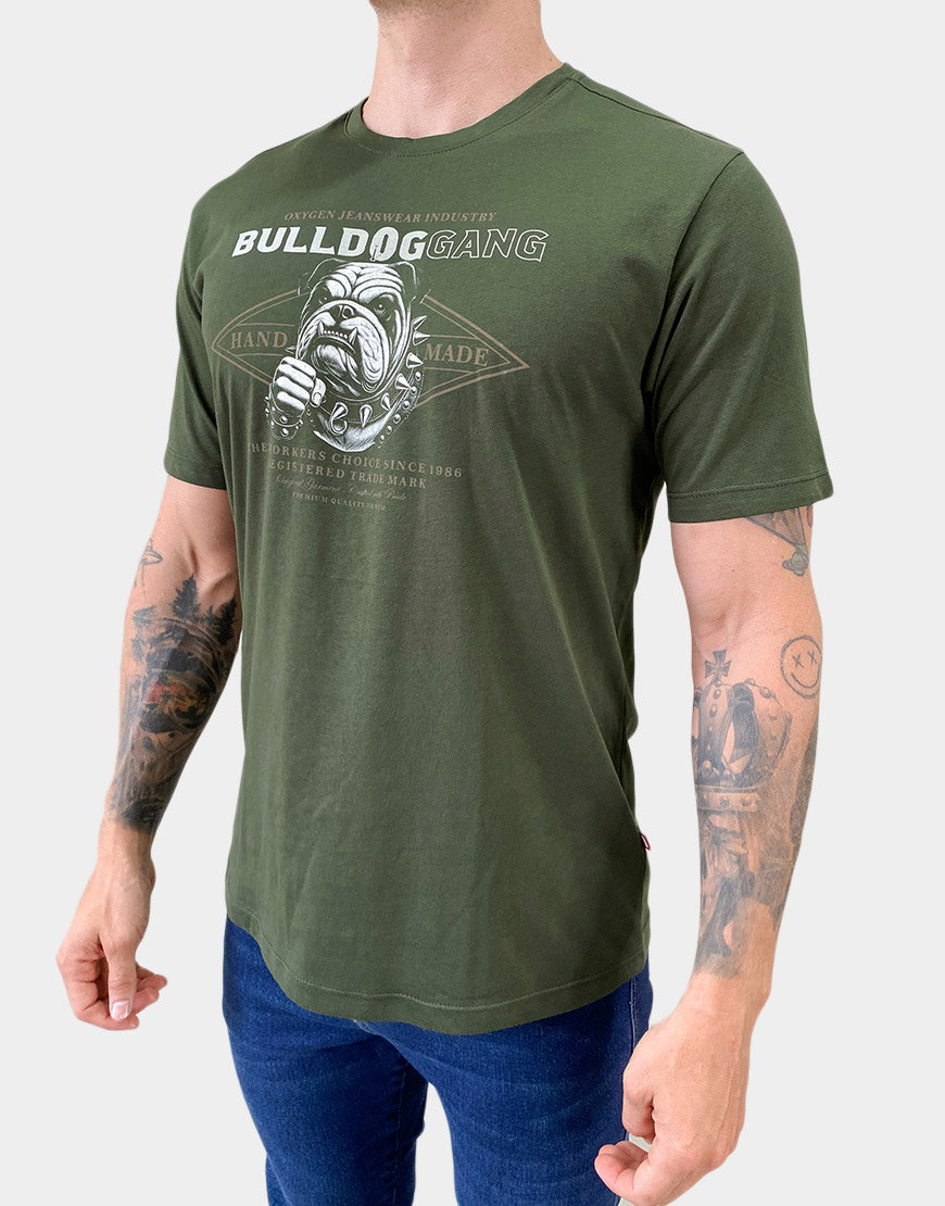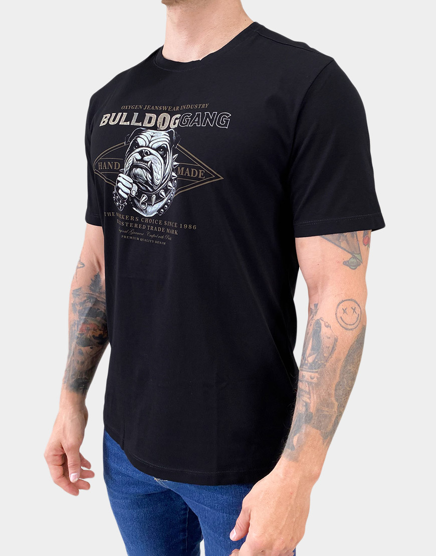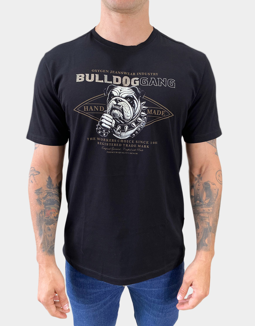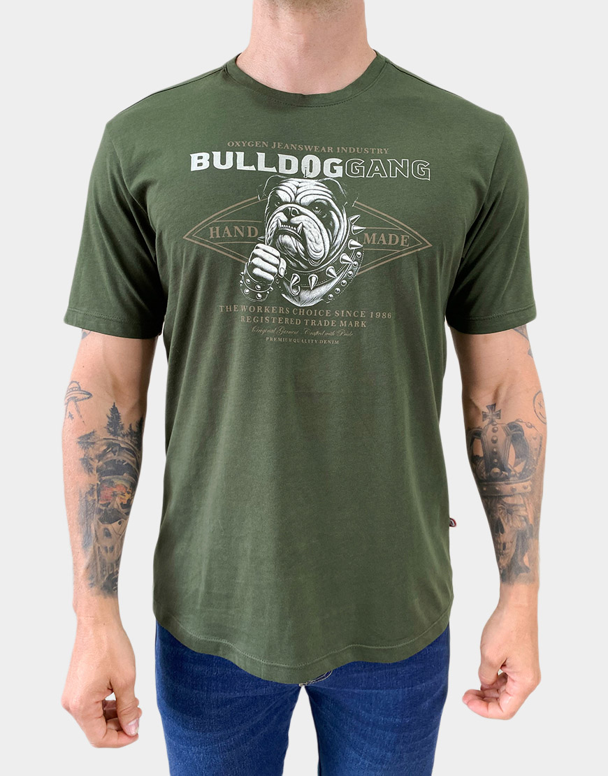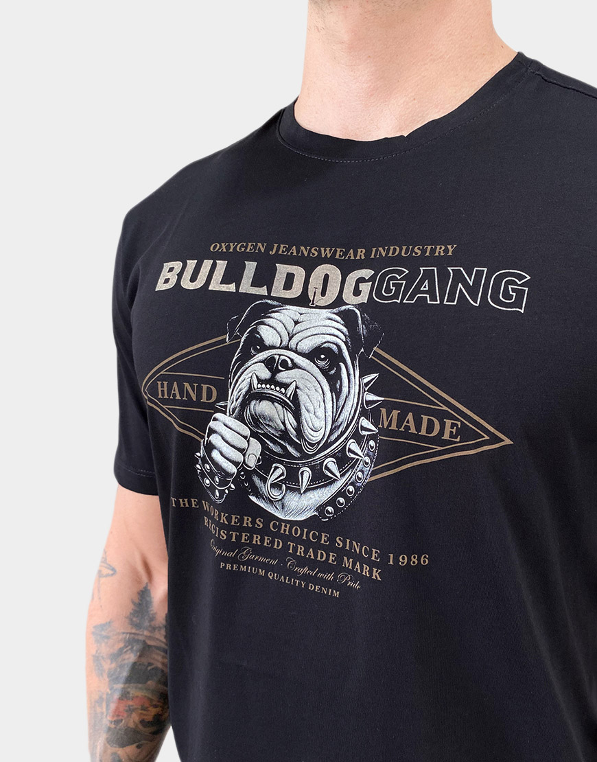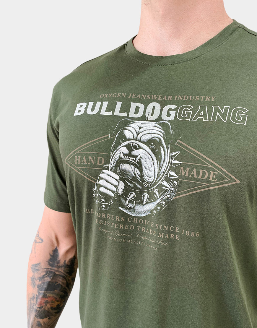 Camiseta para hombre confeccionada en 100% algodón, con estampado frontal de estilo gráfico Bulldog Gang. Diseño de corte clásico y cuello redondo, ideal para un look casual con actitud urbana.