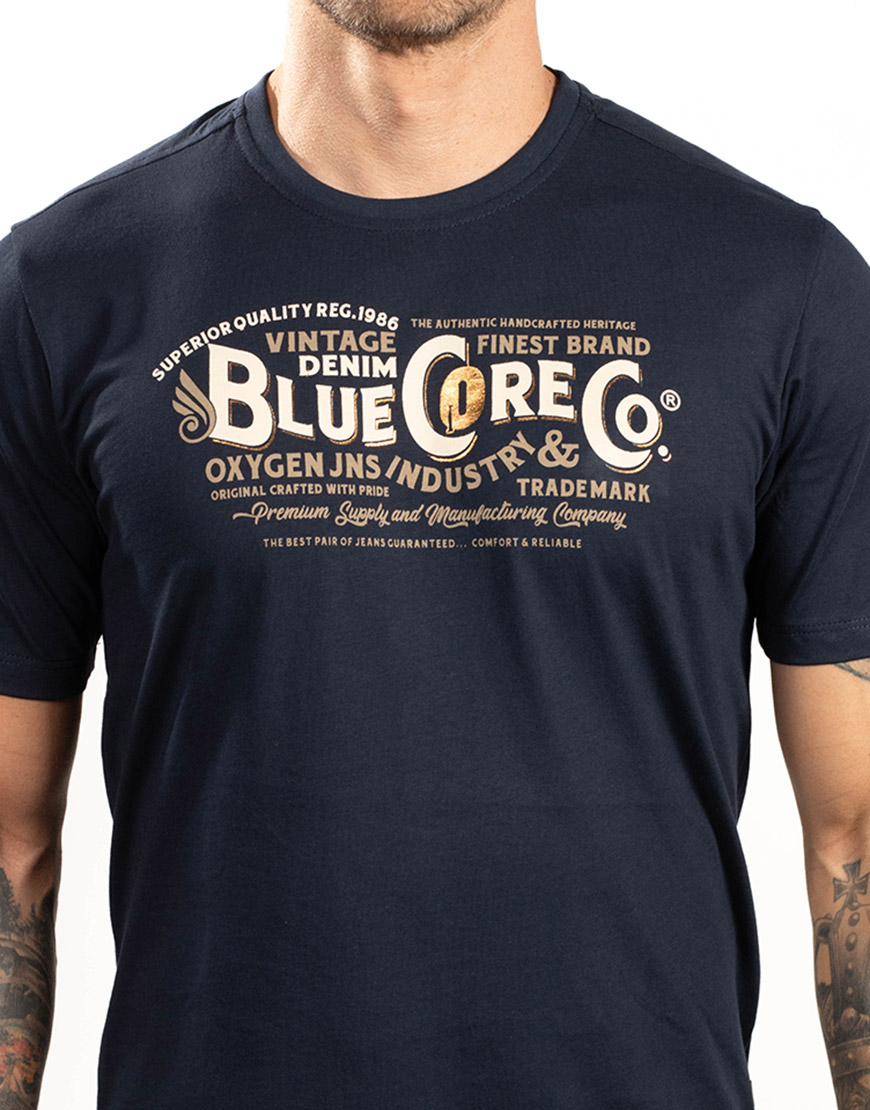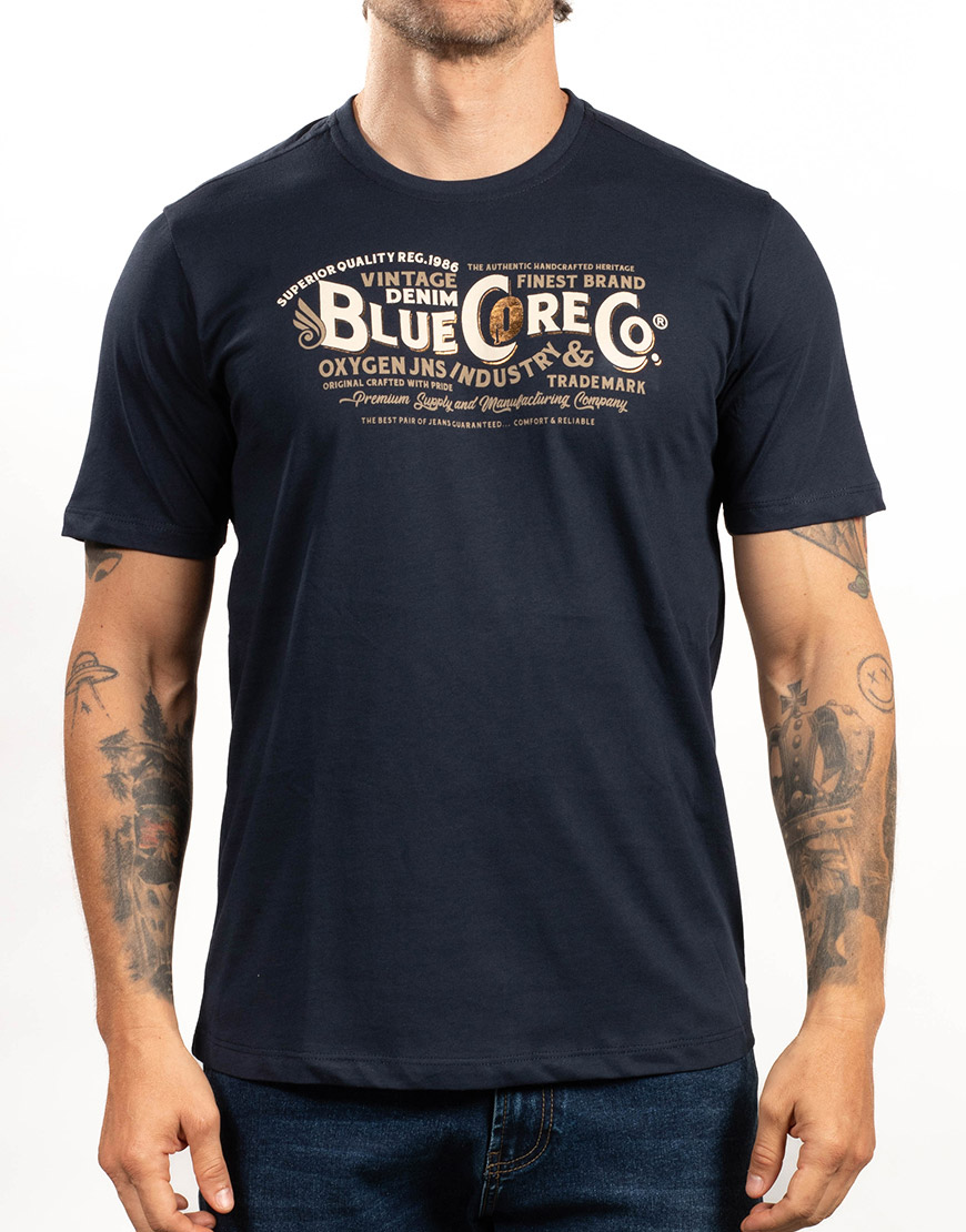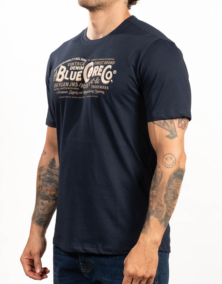 Camiseta para hombre elaborada en tejido de punto 100% algodón suave, con ajuste regular fit que ofrece comodidad y movilidad. Presenta cuello redondo reforzado, mangas cortas y estampado gráfico frontal Blue Core aplicado mediante serigrafía de alta definición para mayor durabilidad.