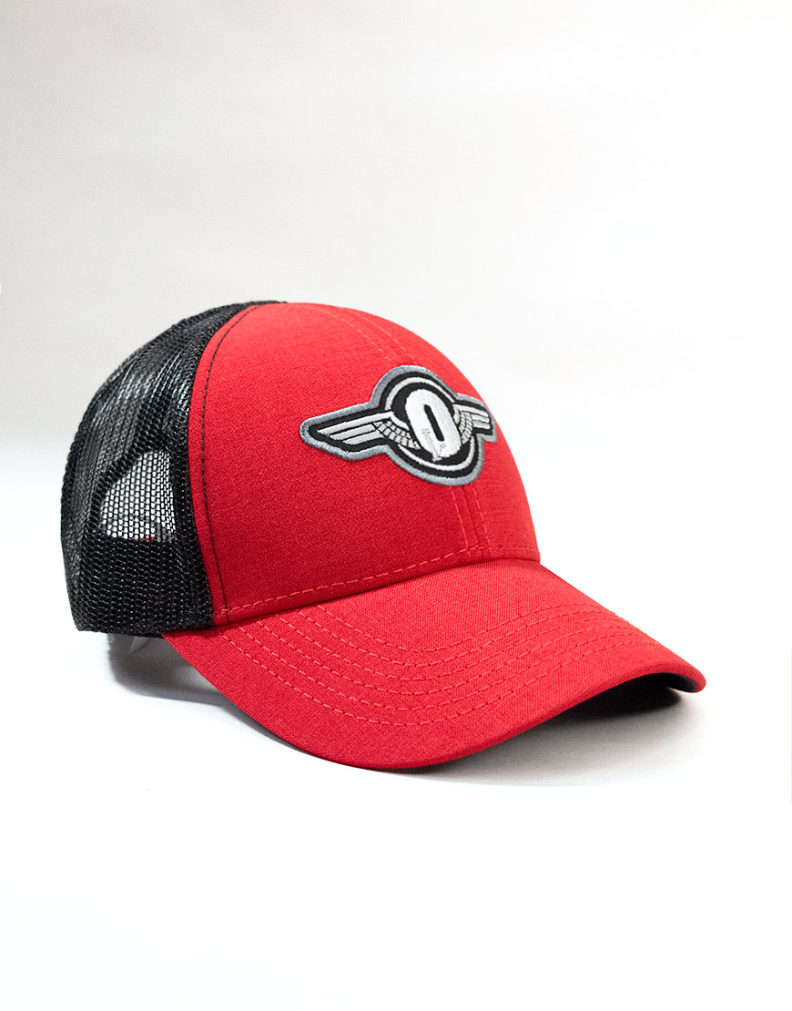 Gorra estructurada de seis cascos. La visera frontal y el panel frontal están confeccionados en tejido plano (posiblemente algodón o poliéster), mientras que los paneles traseros son de malla para ventilación (Estilo Trucker). Incluye un parche o bordado emblemático de la «O» y alas en el panel frontal. El ajuste trasero es con broche o correa.