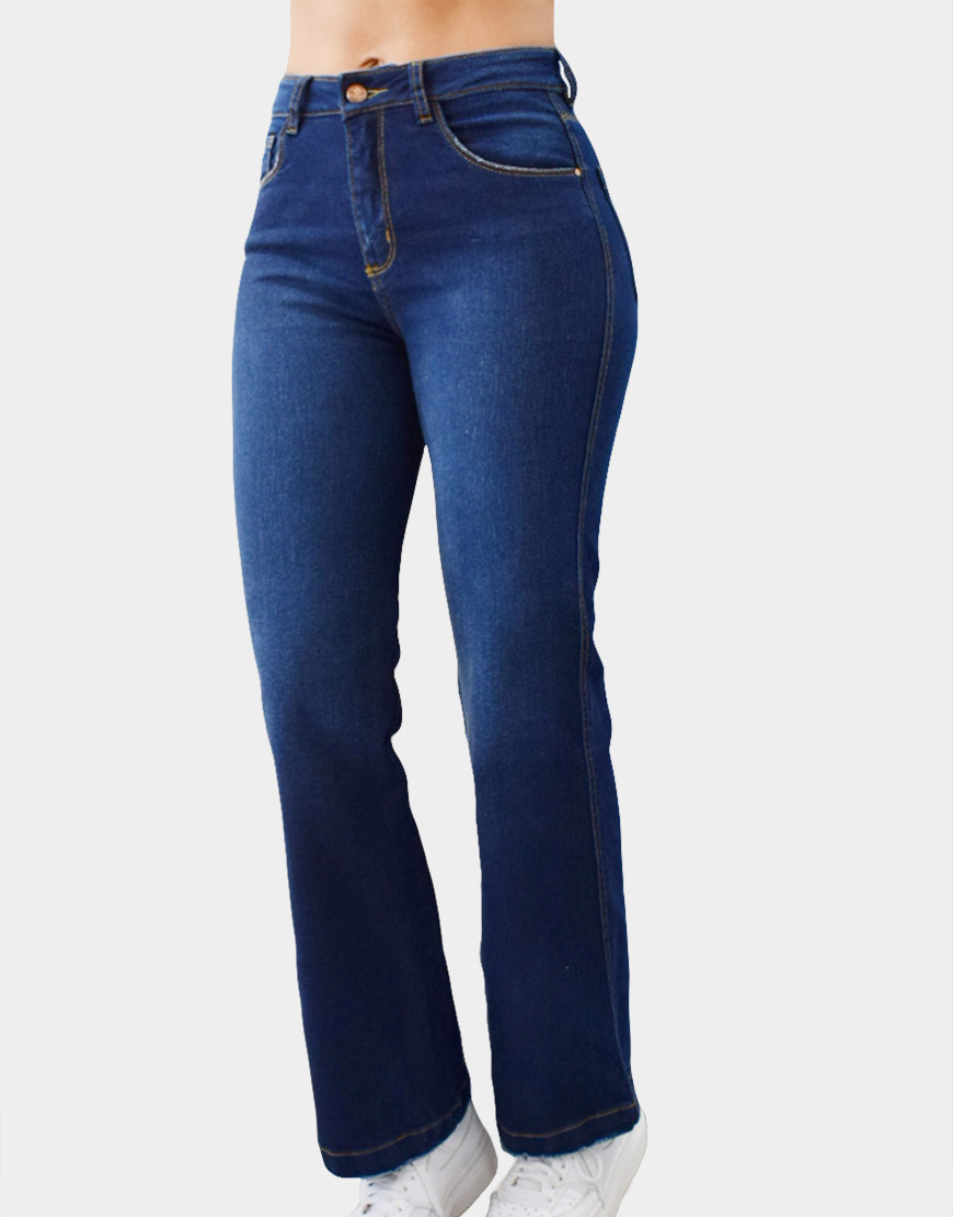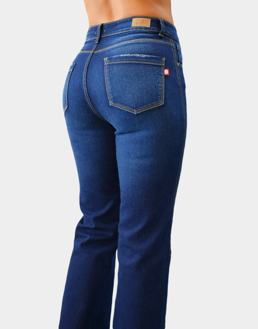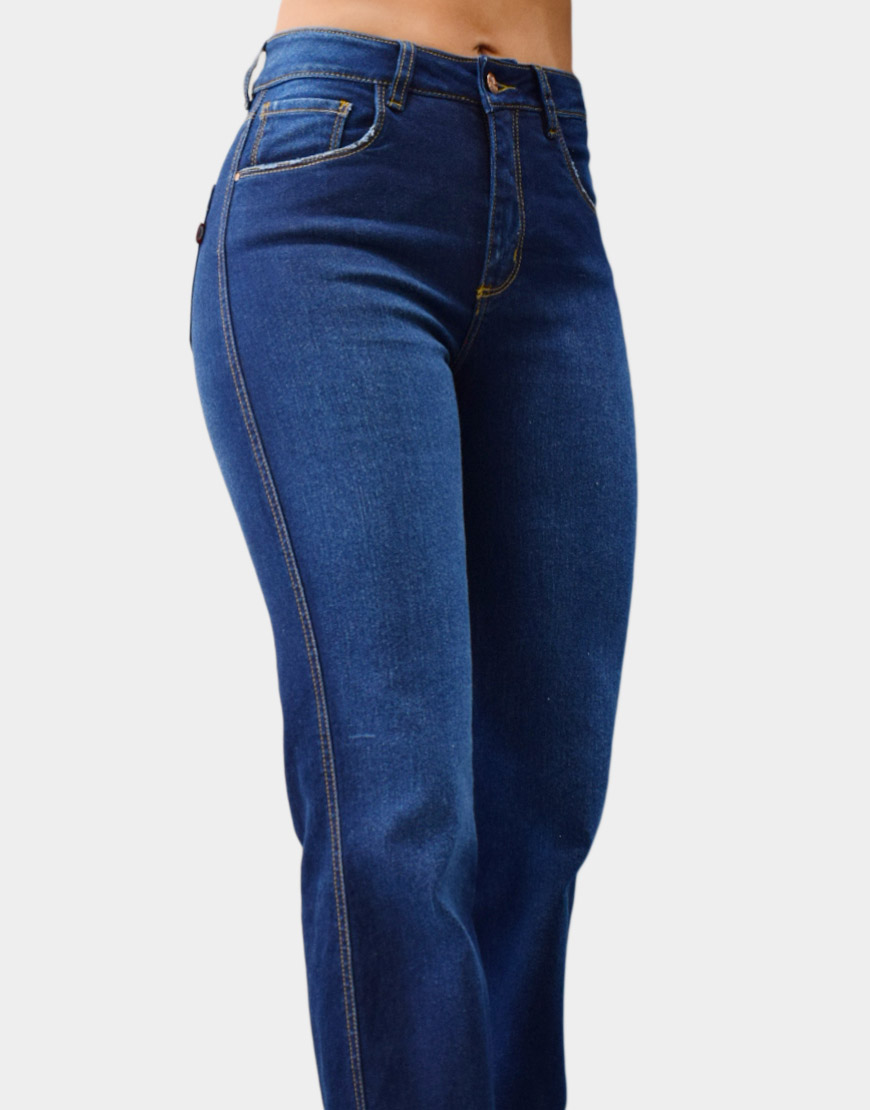ean para mujer confeccionado en denim premium con tecnología stretch, diseñado para moldear la figura con total libertad de movimiento. Esta prenda presenta una silueta de tiro medio-alto con bota semi ancha, ofreciendo un estilo retro-moderno que estiliza las piernas. Cuenta con el sistema tradicional de cinco bolsillos, costuras reforzadas en contraste y un lavado azul profundo uniforme, ideal para combinar en looks casuales o semiformales con un toque de sofisticación urbana.