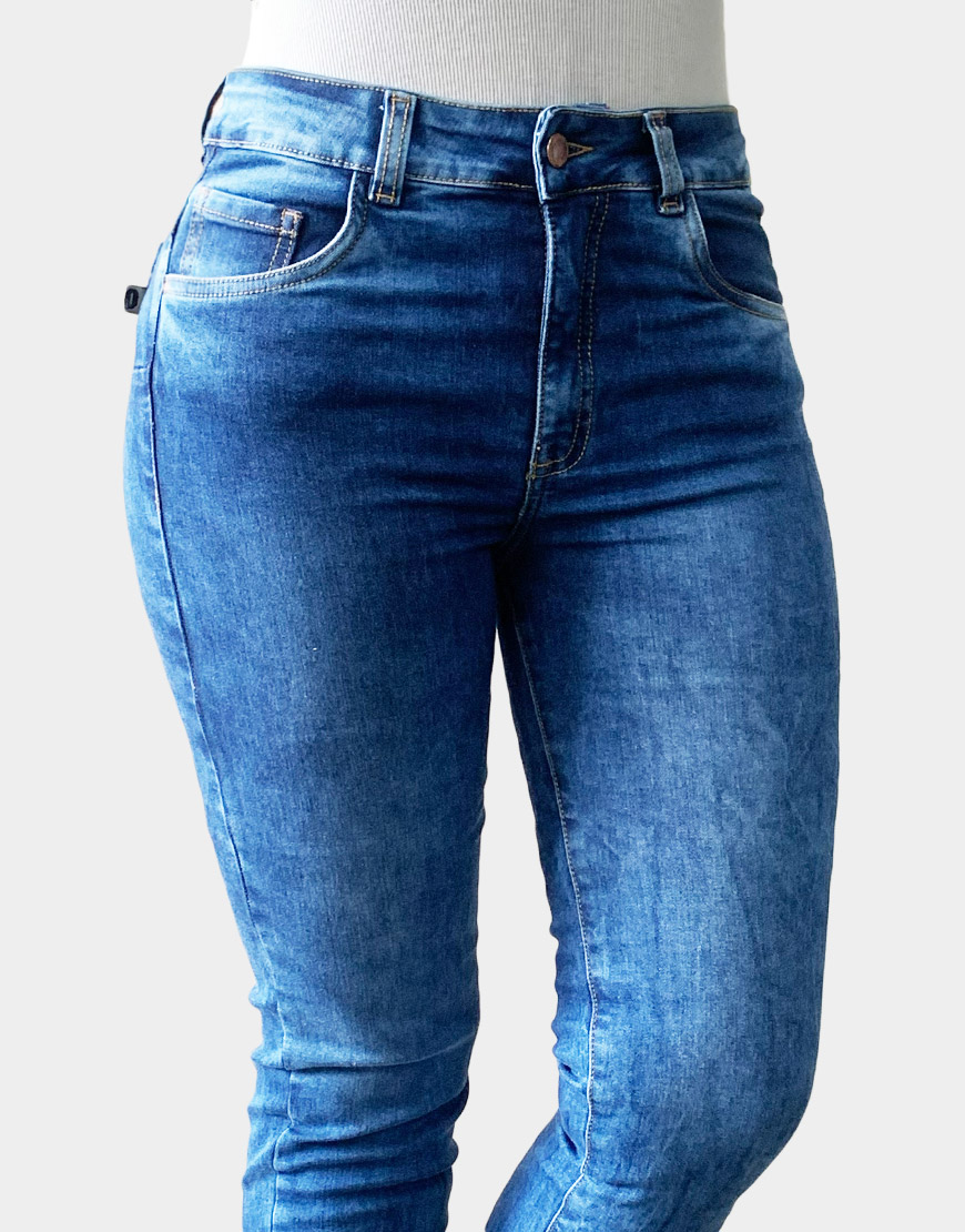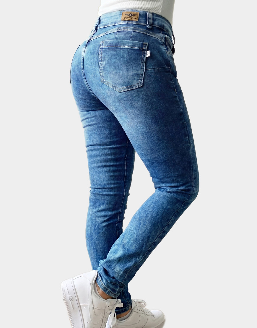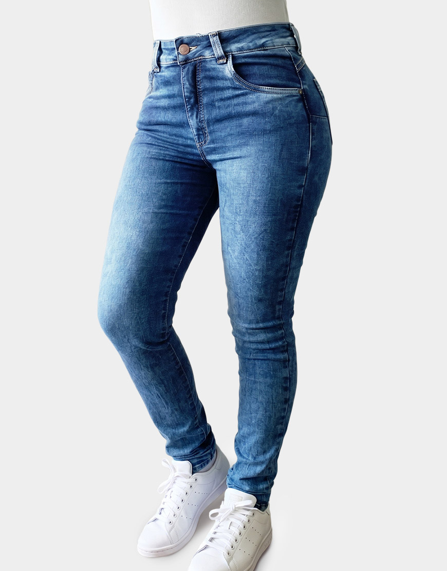Jean ajustado para mujer confeccionado en denim stretch de alta elasticidad, diseñado para moldear la silueta con confort superior. Presenta un lavado azul medio con efectos de veteado y aclarados sutiles en los muslos. Cuenta con un tiro medio-alto, pretina de un botón metálico y costuras reforzadas, ideal para un estilo casual estilizado y versátil.