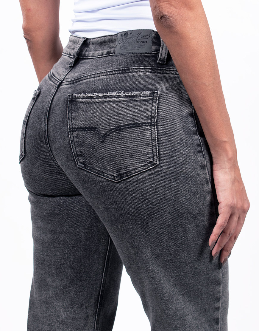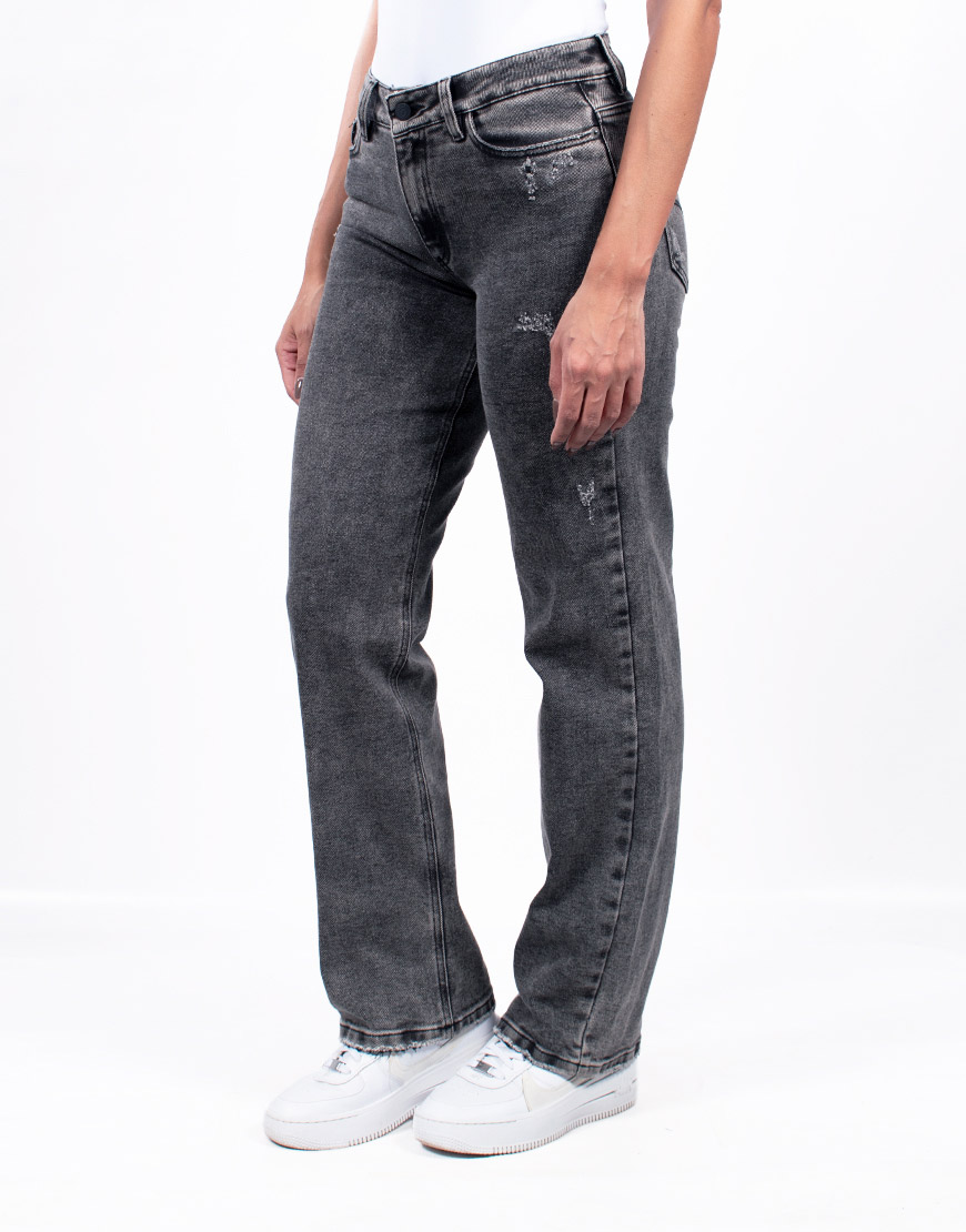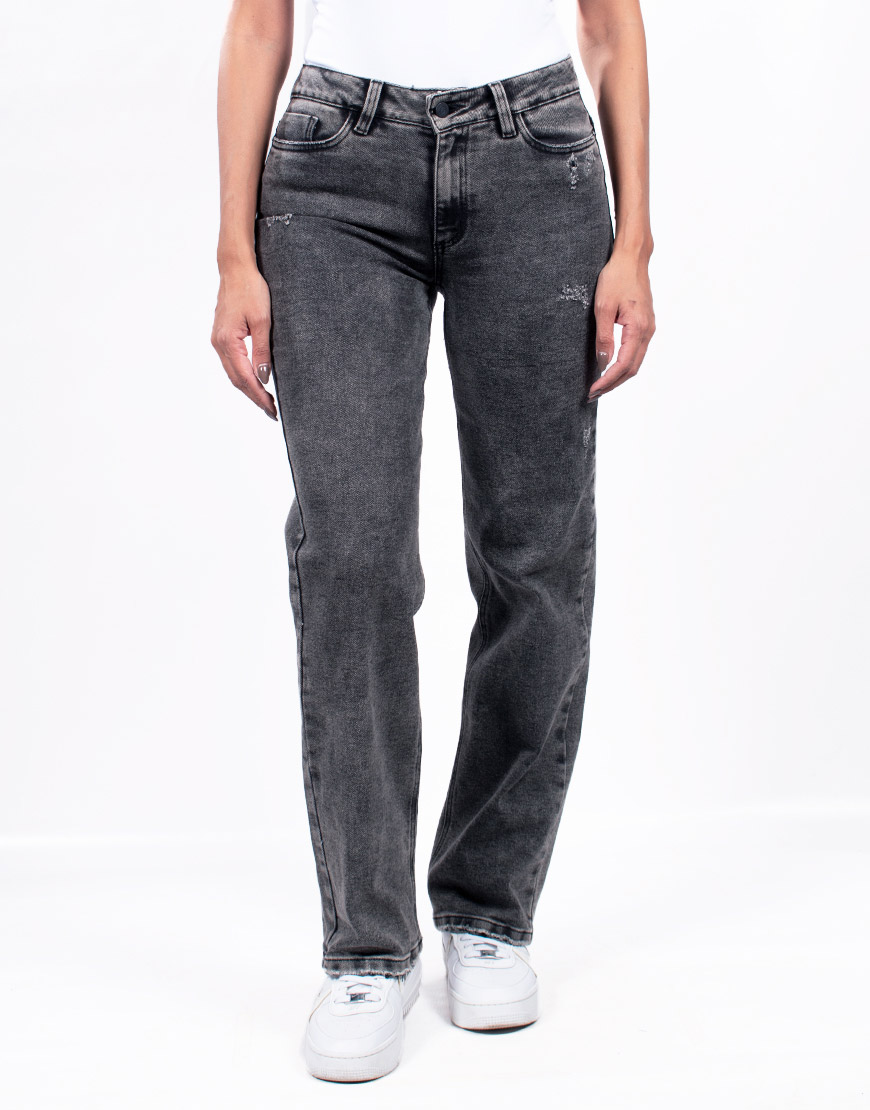 Pantalón jean de dama con silueta Regular Fit y bota suelta/recta. El tejido denim está compuesto por 70% Algodón, 26% Poliéster, 3% Rayón y 1% Elastano. El diseño es de cinco bolsillos estándar y presenta un cierre frontal de cremallera y botón en la pretina.