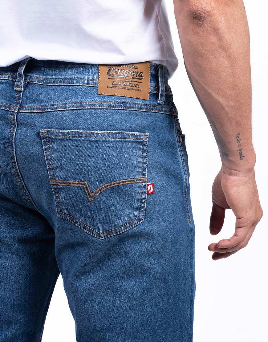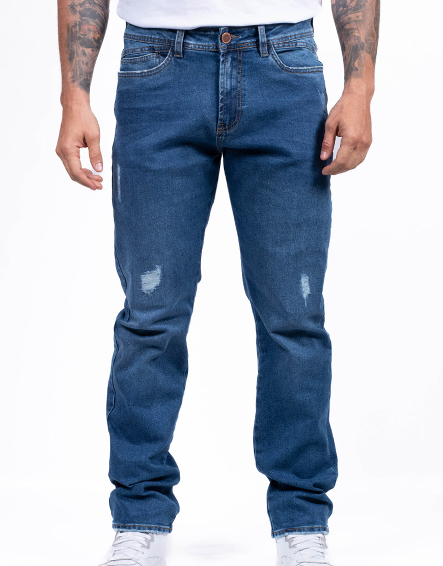 Pantalón jean para hombre con silueta Regular Fit y corte recto, diseñado para un ajuste ergonómico y funcional. Confeccionado en denim premium de alta resistencia, incorpora un proceso de lavado con efectos de desgaste sutil localizado y detalles de distress controlados; cuenta con el sistema tradicional de cinco bolsillos, costuras de seguridad industriales y cierre frontal mediante cremallera técnica y botón metálico de alta durabilidad.