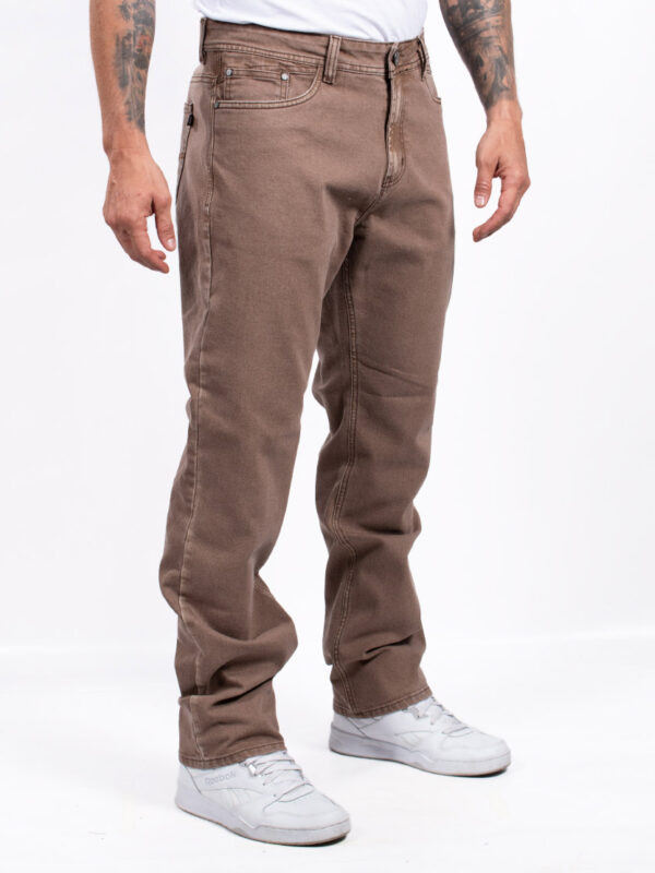 Pantalón jean de hombre con silueta Regular Fit (Referencia RUSH). El tejido denim es de color Índigo Negro y está compuesto por 71% Algodón, 25% Poliéster, 3% Rayón y 1% Elastano. Presenta cinco bolsillos, incluyendo una relojera con un bordado de emblema. El diseño incorpora remaches metálicos y los bolsillos traseros tienen un corte de diseño distintivo. Cierre frontal de cremallera con botón