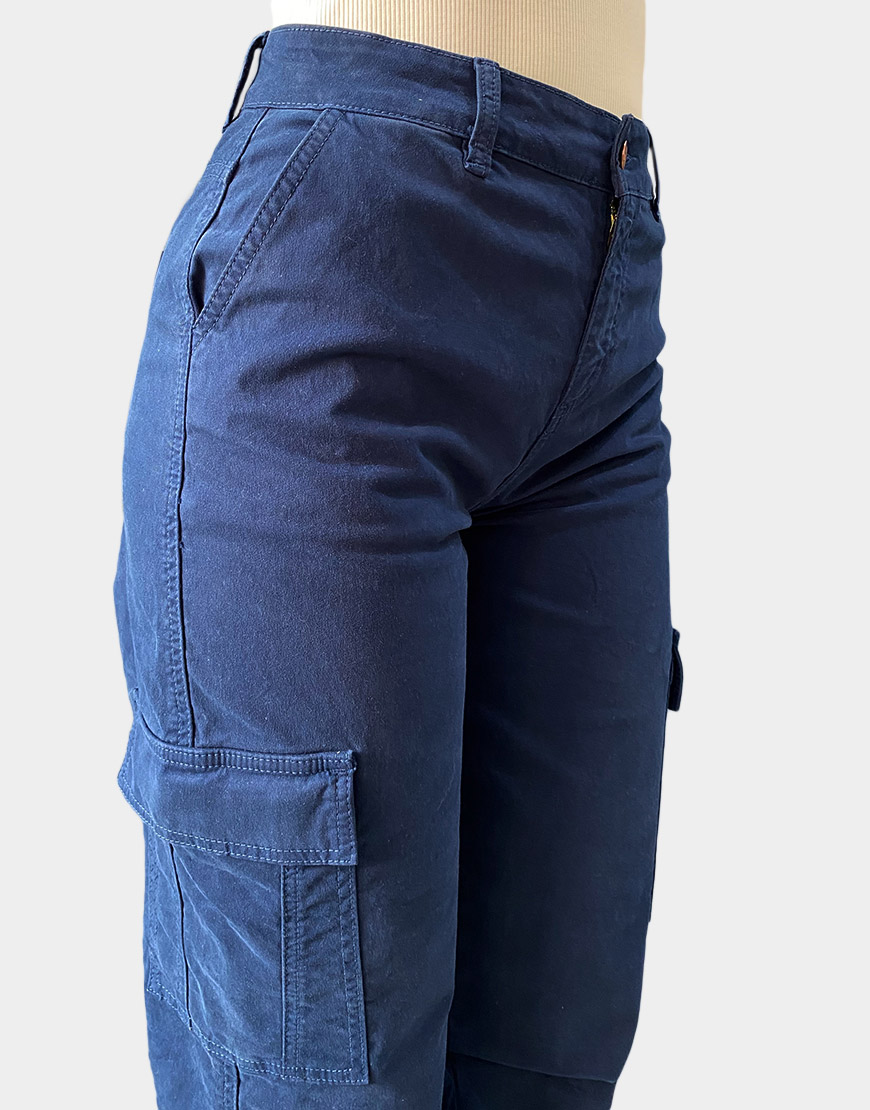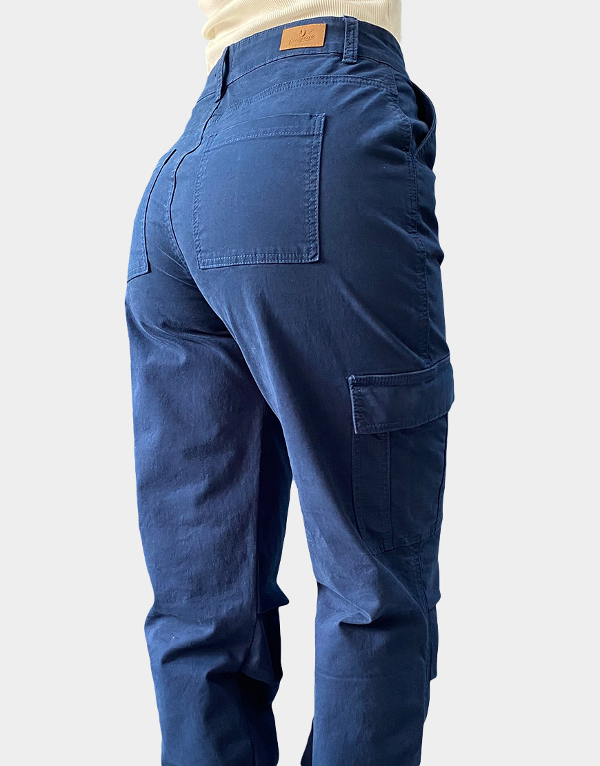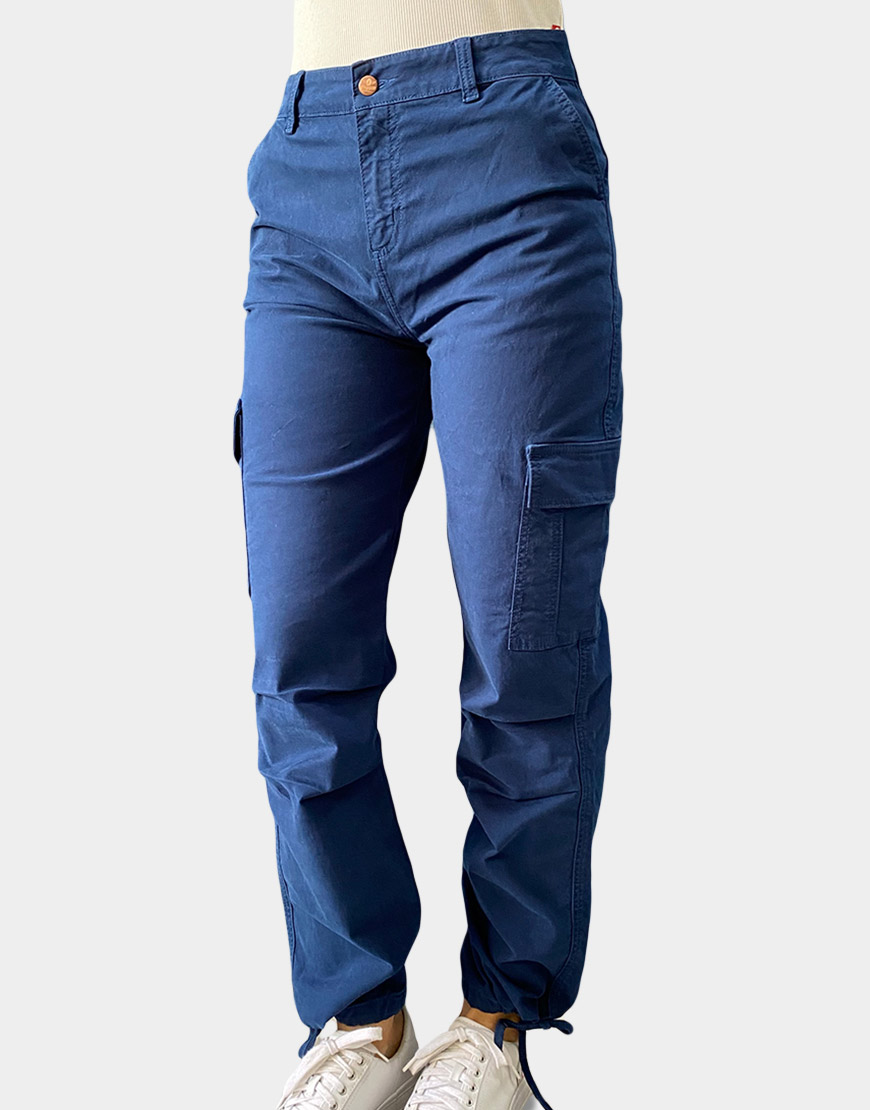 Pantalón para dama tipo cargo confeccionado en drill de alta resistencia con fibras elásticas para un ajuste cómodo y flexible. Presenta un diseño funcional en un profundo tono azul navy, destacando por sus bolsillos laterales de parche con tapa y un práctico sistema de ajuste con cordones en los tobillos, permitiendo variar la silueta de recta a jogger. Su pretina clásica con botón metálico cobrizo y pasadores lo convierte en una prenda versátil para un estilo urbano y utilitario