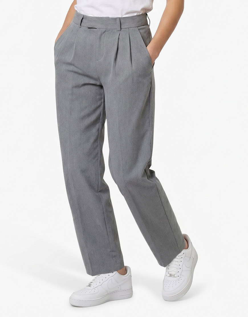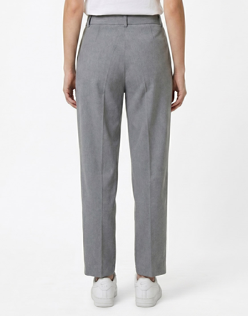 Pantalón clásico para dama confeccionado en un tejido ligero de alta caída, ideal para un estilo de oficina o casual refinado. Presenta una silueta de corte recto (straight) con tiro alto que estiliza la figura de manera natural. El diseño incluye una pretina formal con pasadores, bolsillos laterales funcionales y un delicado detalle de pinzas frontales que aportan volumen y elegancia al movimiento de la prenda en su tono gris melange.
