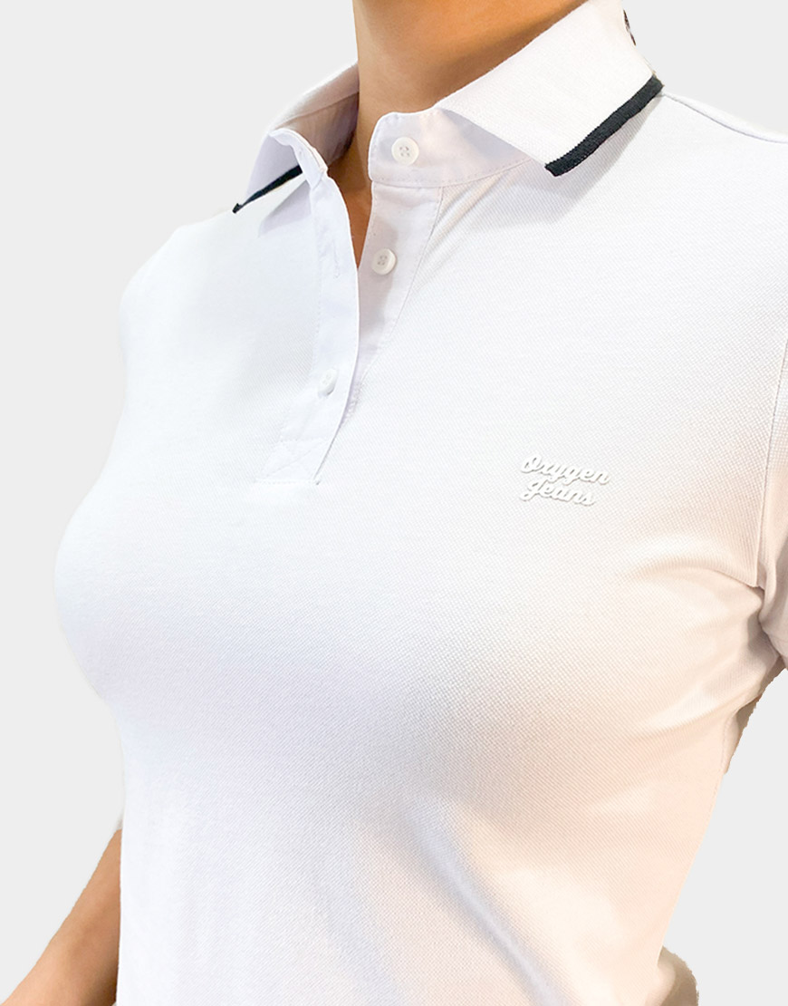 Camiseta tipo polo para dama confeccionada en tejido piqué de algodón premium, que ofrece una textura transpirable y una estructura impecable. Su diseño de silueta Slim Fit en color blanco cuenta con un cuello de solapa clásico y pechera de tres botones para un ajuste definido. El estilo se distingue por el detalle de punto corazón estampado en el pecho, acompañado de ribetes en contraste azul marino en el cuello y las mangas, equilibrando la elegancia deportiva con un toque casual y moderno.