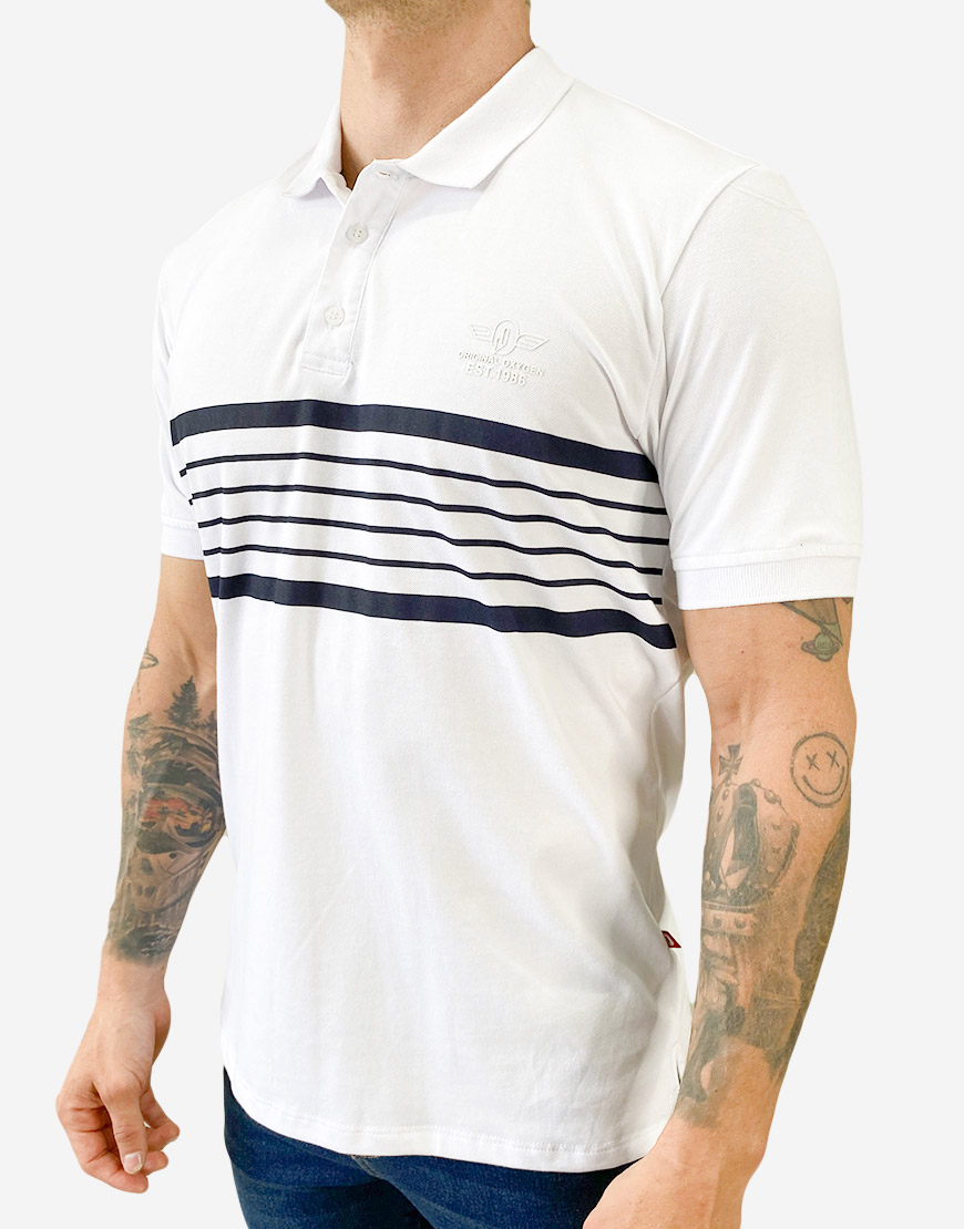 Polo Regular Fit para hombre, elaborado en suave algodón piqué que garantiza máxima frescura y comodidad. Su diseño moderno destaca por el estampado de líneas en el frente y un acabado estructurado gracias al cuello y puños tejidos.